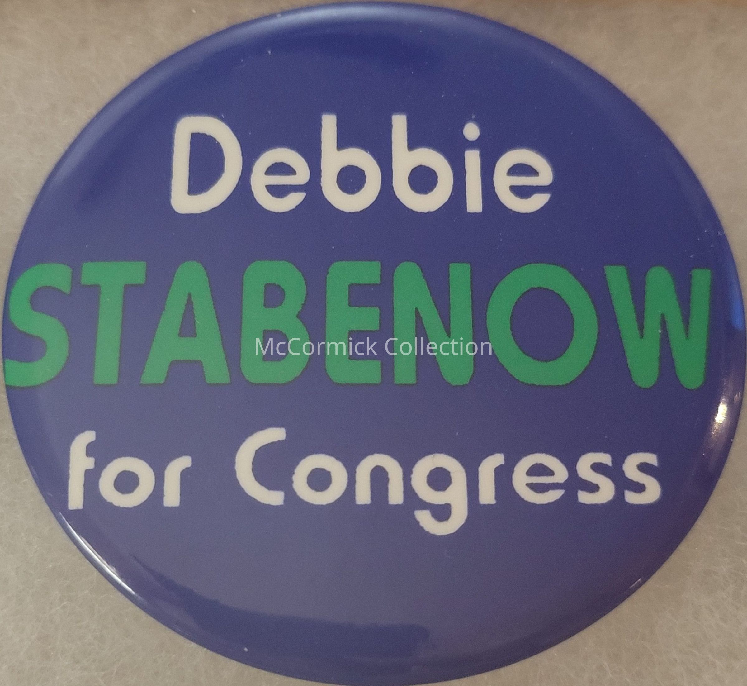 A 2.25" blue, green, and white political button for Debbie Stabenow for Congress, circa 1996 or 1998; uses her trademark color scheme.