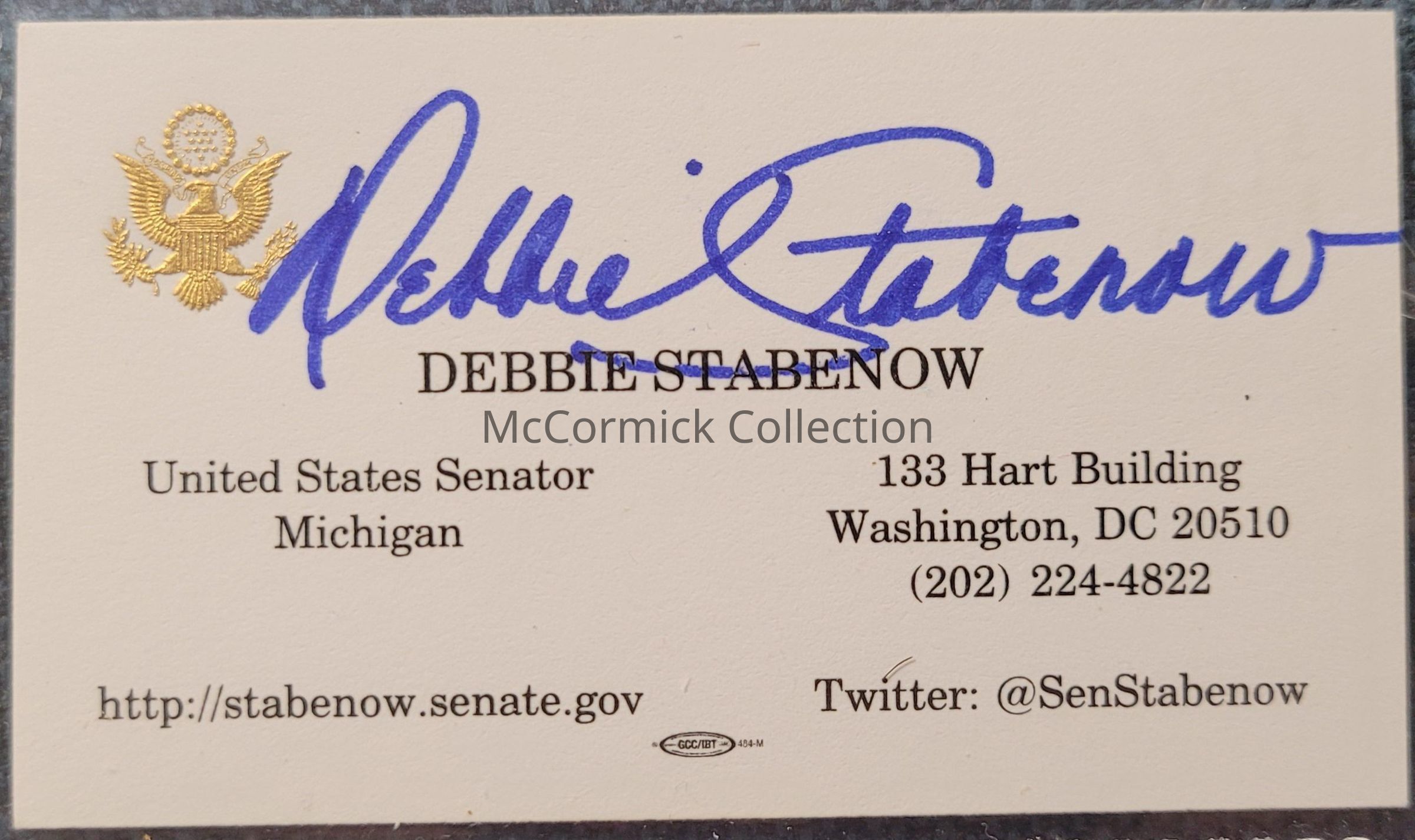 Business card of United States Senator Debbie Stabenow, signed in blue.
