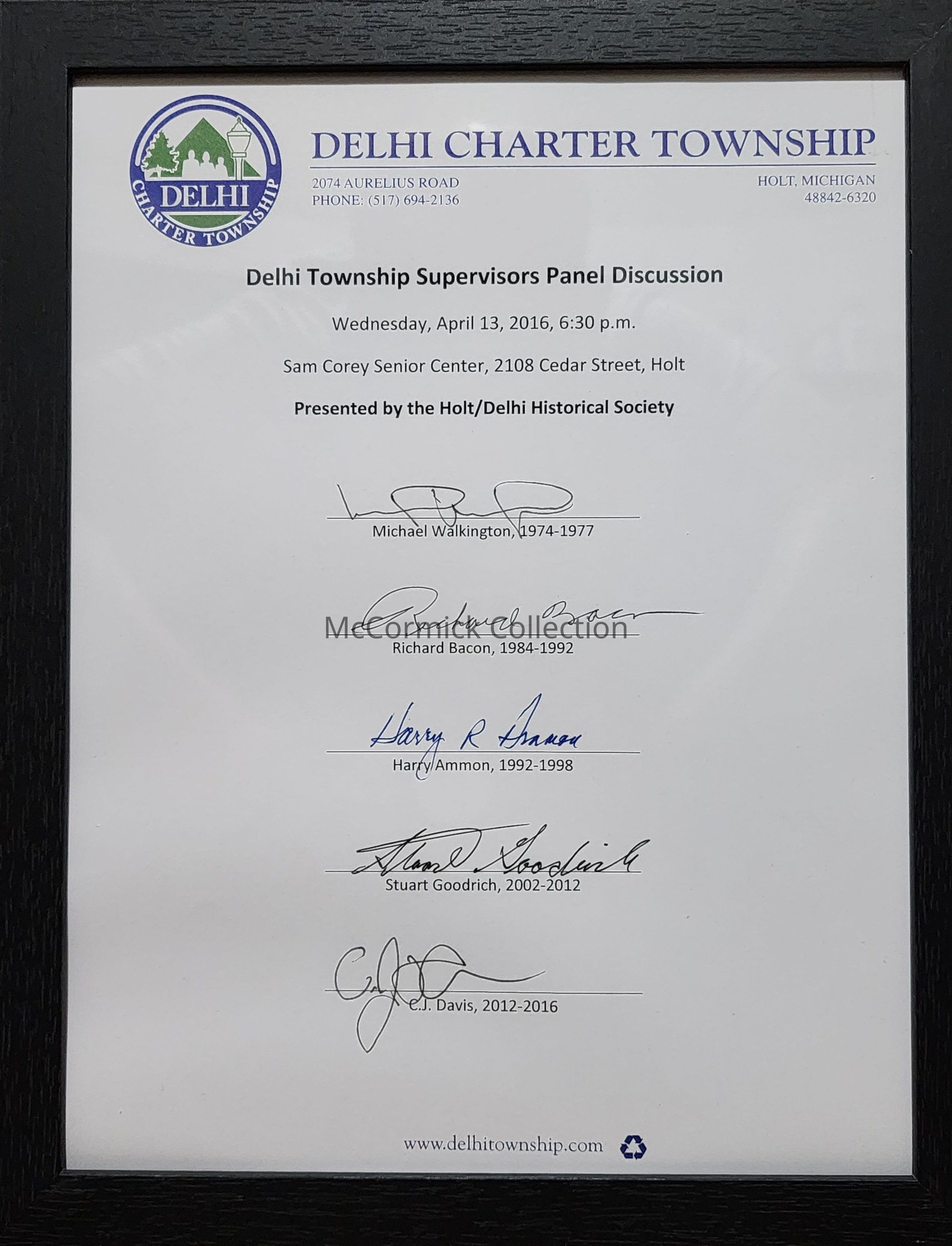 Letterhead from Delhi Charter Township, signed in April 2016, by living former Township Supervisors who were able to attend an event at which they spoke and reflected on their terms in office. Signed by Michael Walkington, Richard Bacon, Harry Ammon, Stuart Goodrich, and C.J. Davis.
