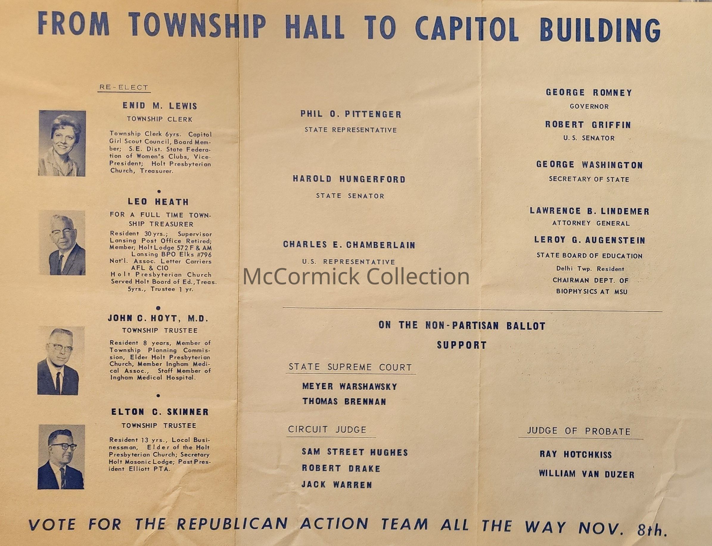 Lists George Romney, Robert Griffin, Leroy Augenstein, Phil Pittenger, Harold Hungerford, Charles Chamberlain, Ray Hotchkiss, Sam Street Hughes, Enid Lewis, Leo Heath, John Hoyt, and Elton Skinner, among other candidates. "From Township Hall to Capitol Building" slogan.