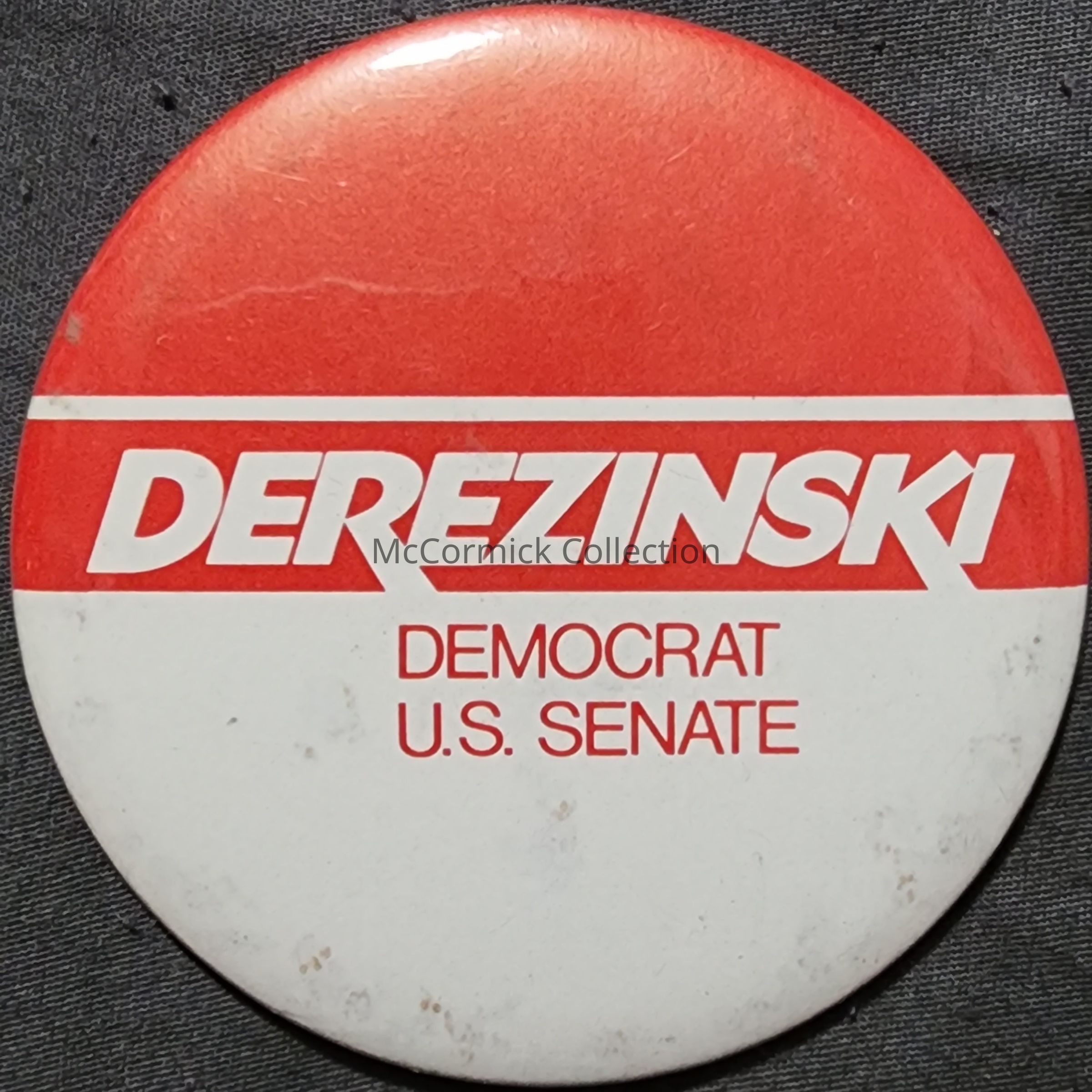 A 2.5" red and white political button for Derezinski for U.S. Senate.