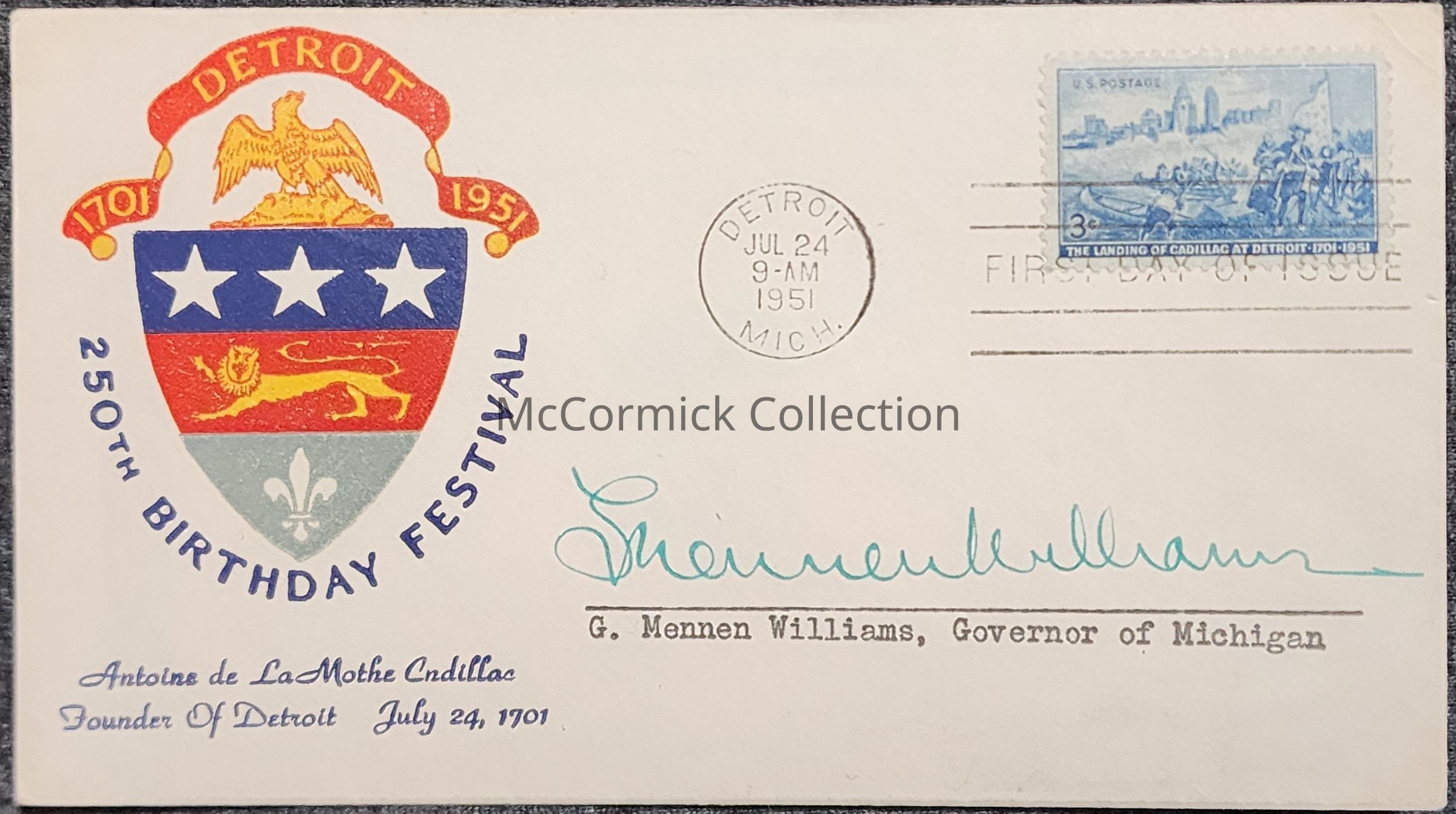 Detroit 250th Anniversary, 1951, First Day Cover, Signed by G. Mennen WilliamsScope and Content