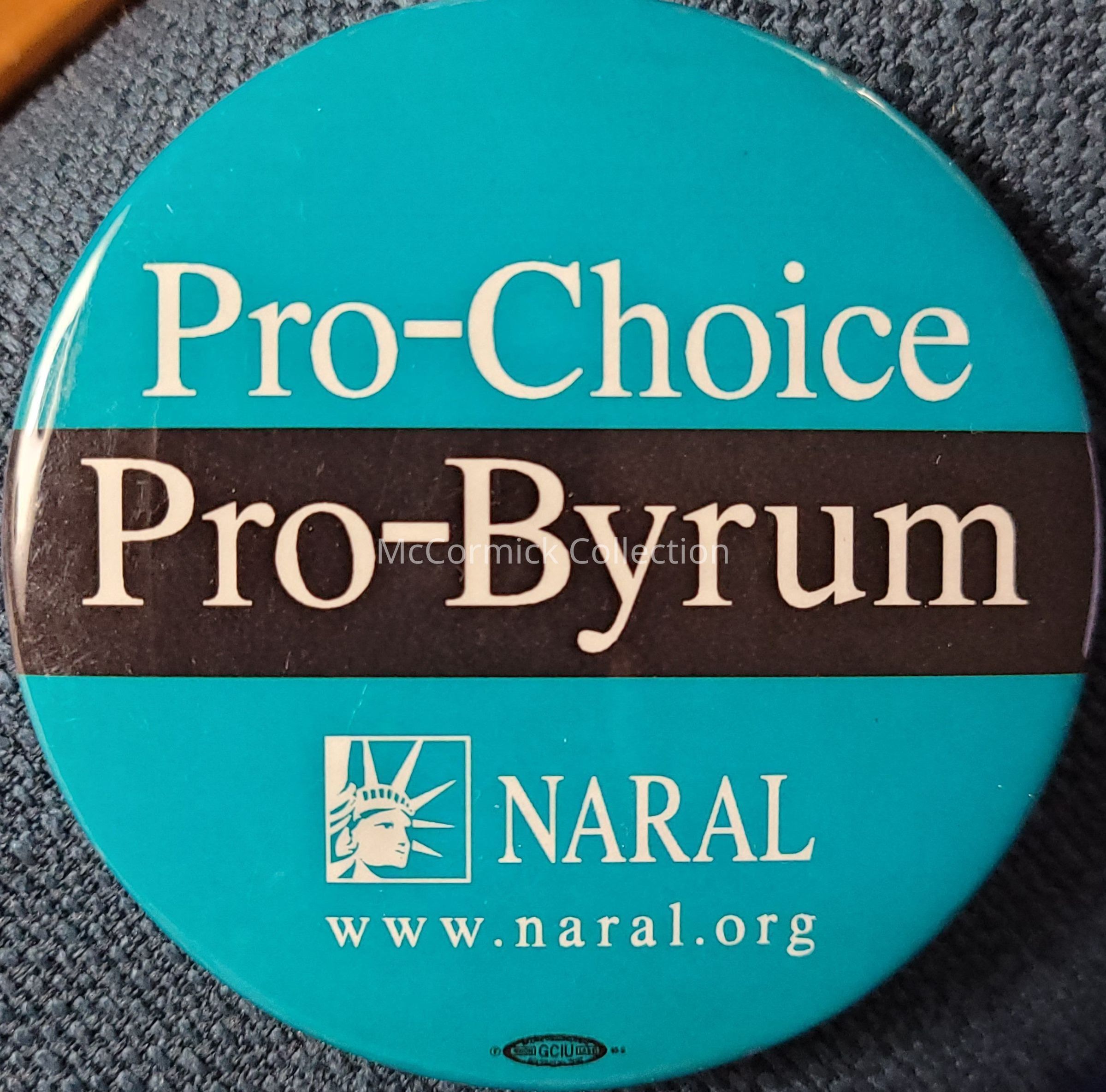 A 3" political button by NARAL for Dianne Byrum for Congress, circa 2000. Slogan is Pro-Choice Pro-Byrum.