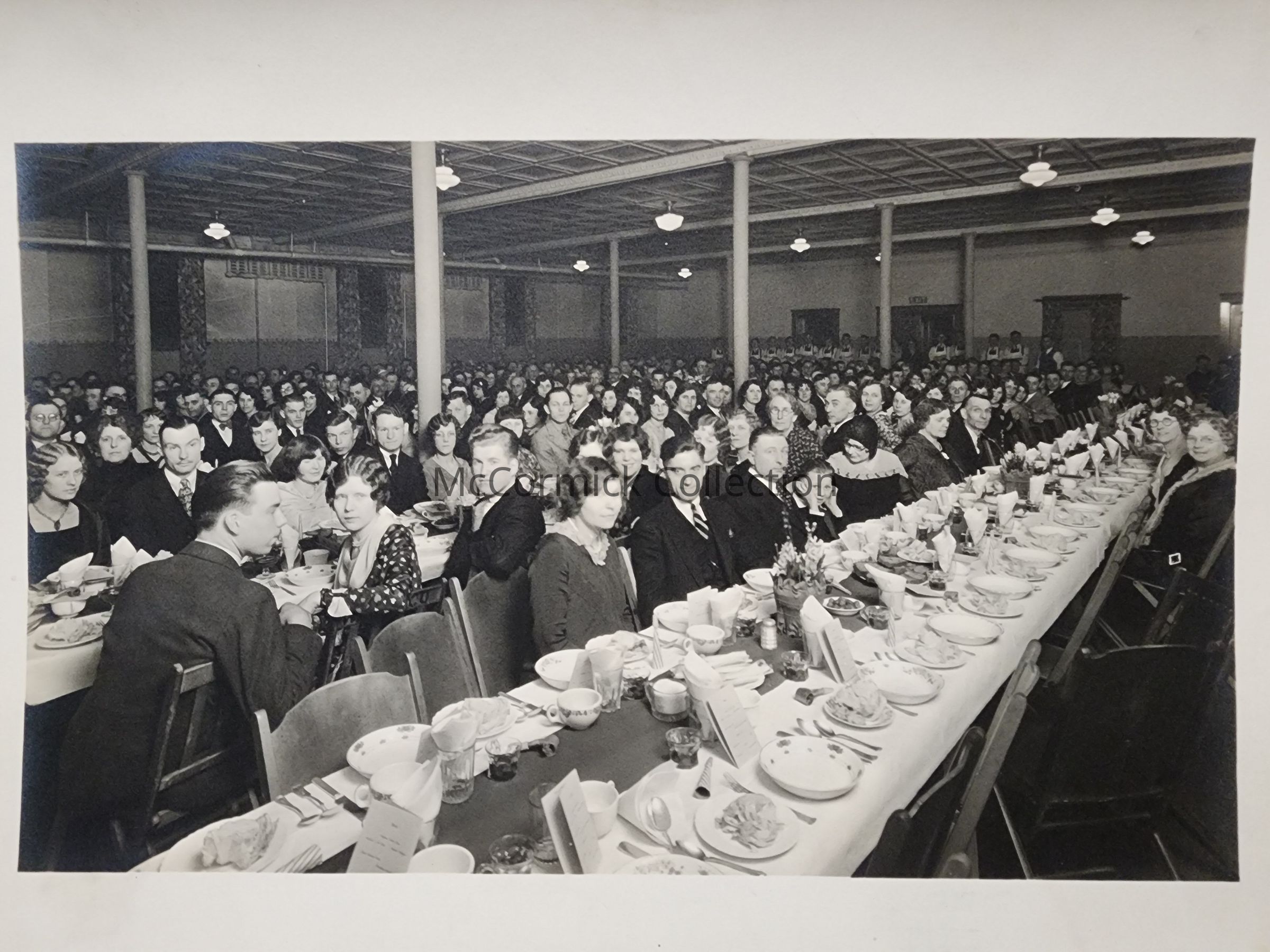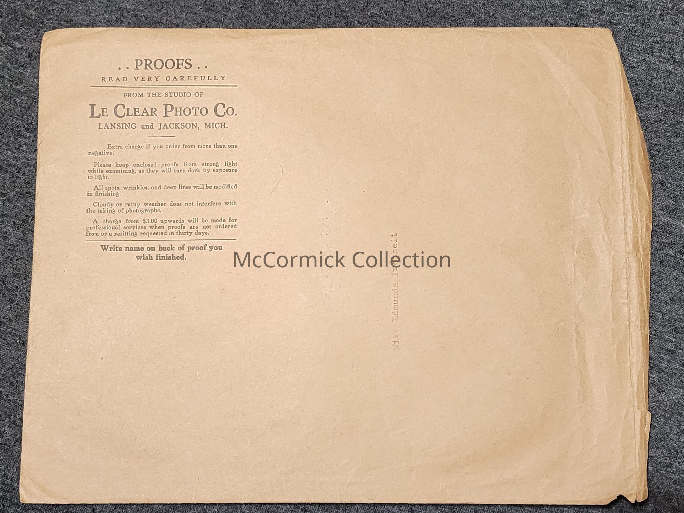 Photographic print photo proof of an unidentified dinner convention event group by Lansing photographer LeClear. Came in an original studio proof mailing envelope addressed to Miss Edmunda Freiheit.