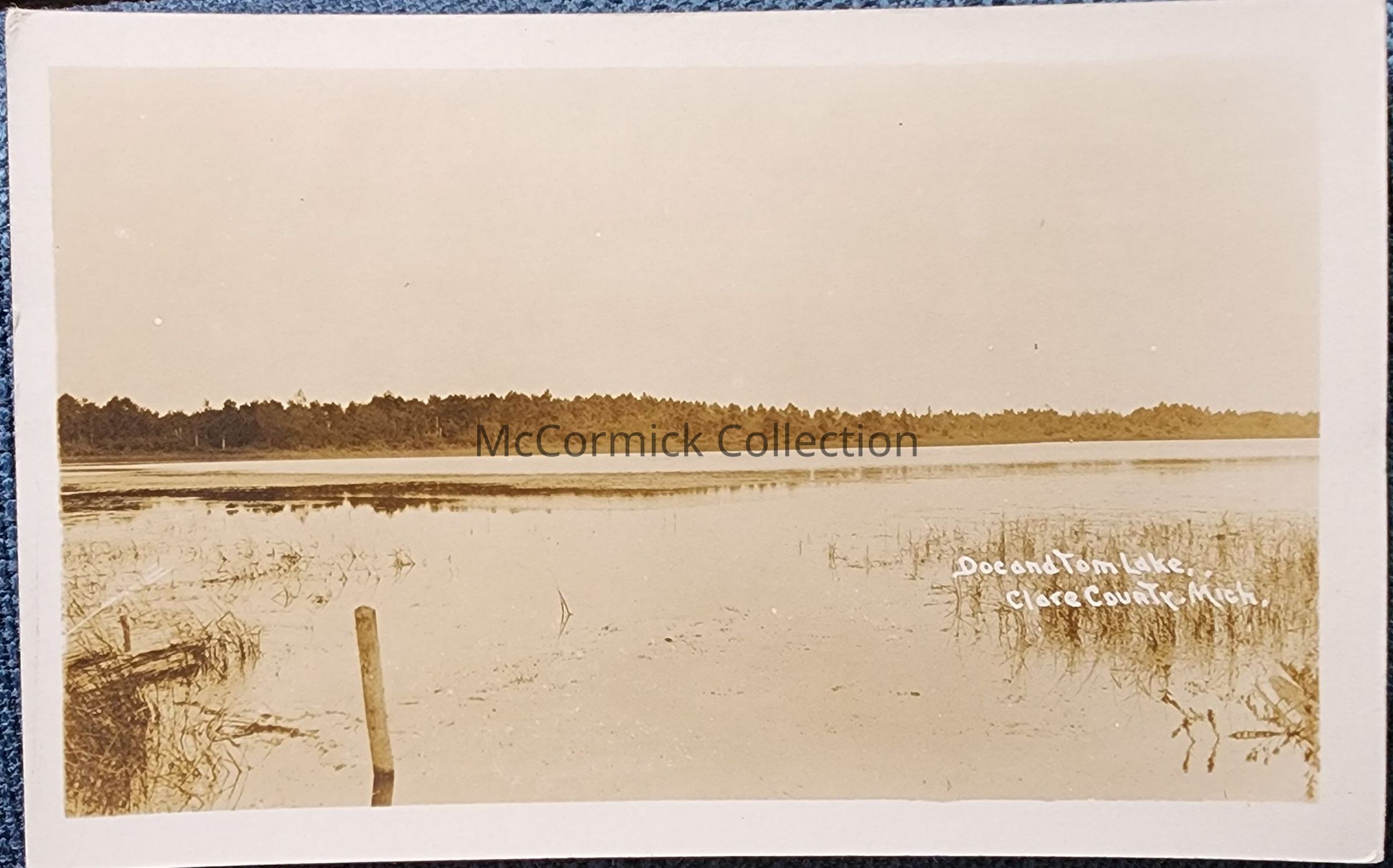 Real photo postcard of Doc and Tom Lake, Clare County, Michigan. Postally used.