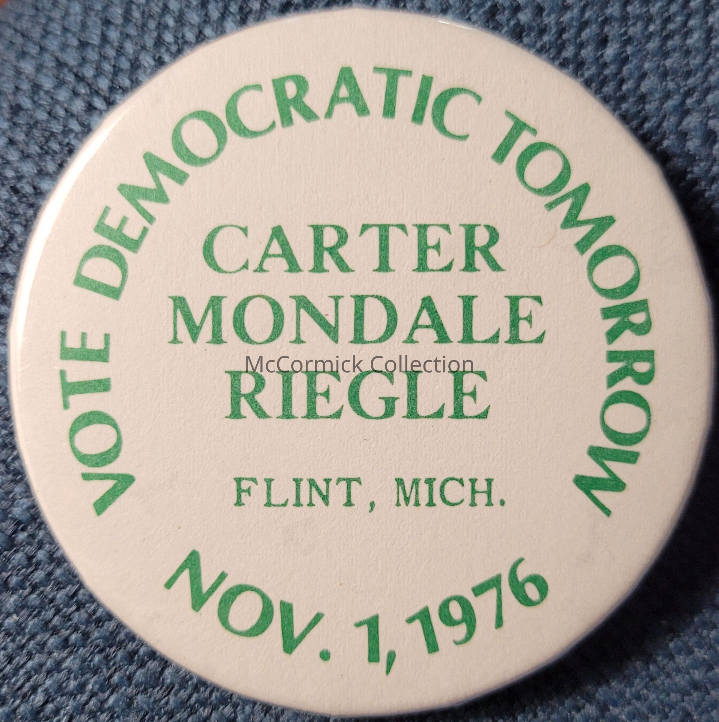 Political button, 2.25", from 1976 from the 1976 general election. This button is a coattail from Flint, Michigan, for Jimmy Carter for President, Walter Mondale for Vice President, and Don Riegle for U.S. Senator.