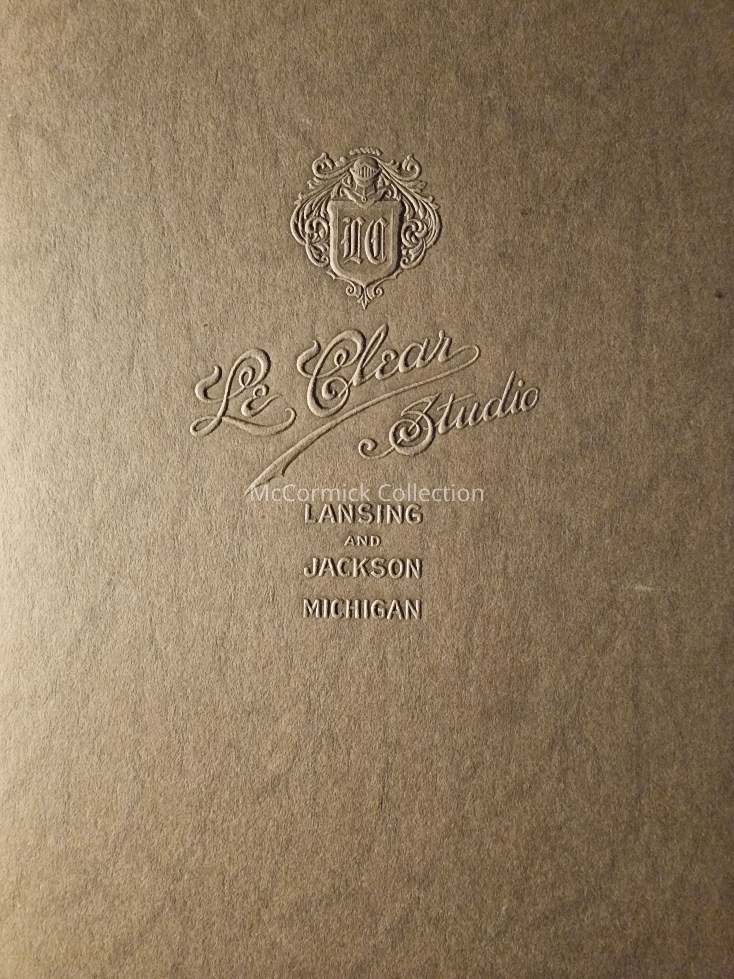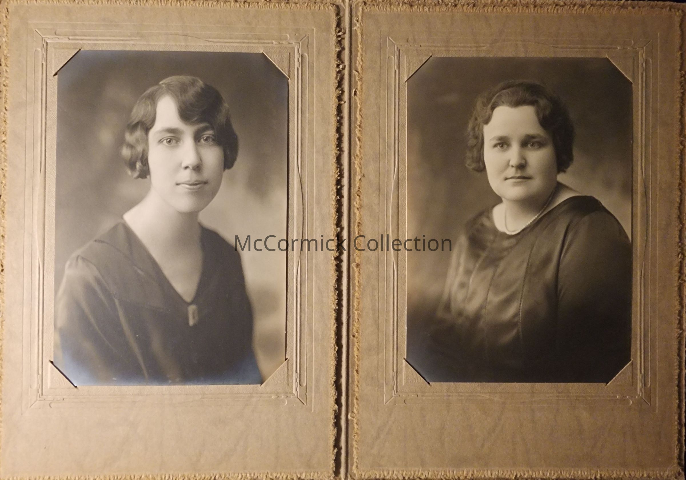 Folder frame mounted double pair of photographs of two unidentified women by Lansing photographer LeClear.