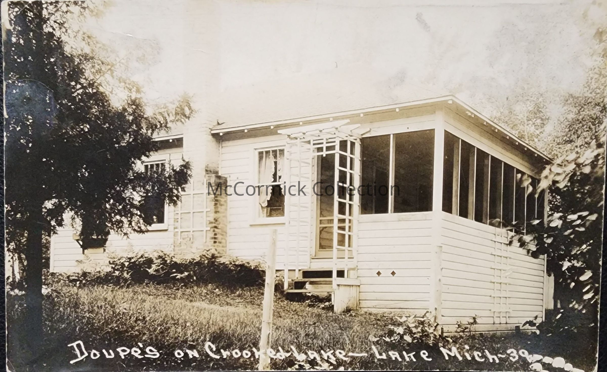 Real photo postcard of the Doupe's Cottage on Crooked Lake in Lake, Michigan. Negative number is 39. Postally used, 1937 Lake postmark.
