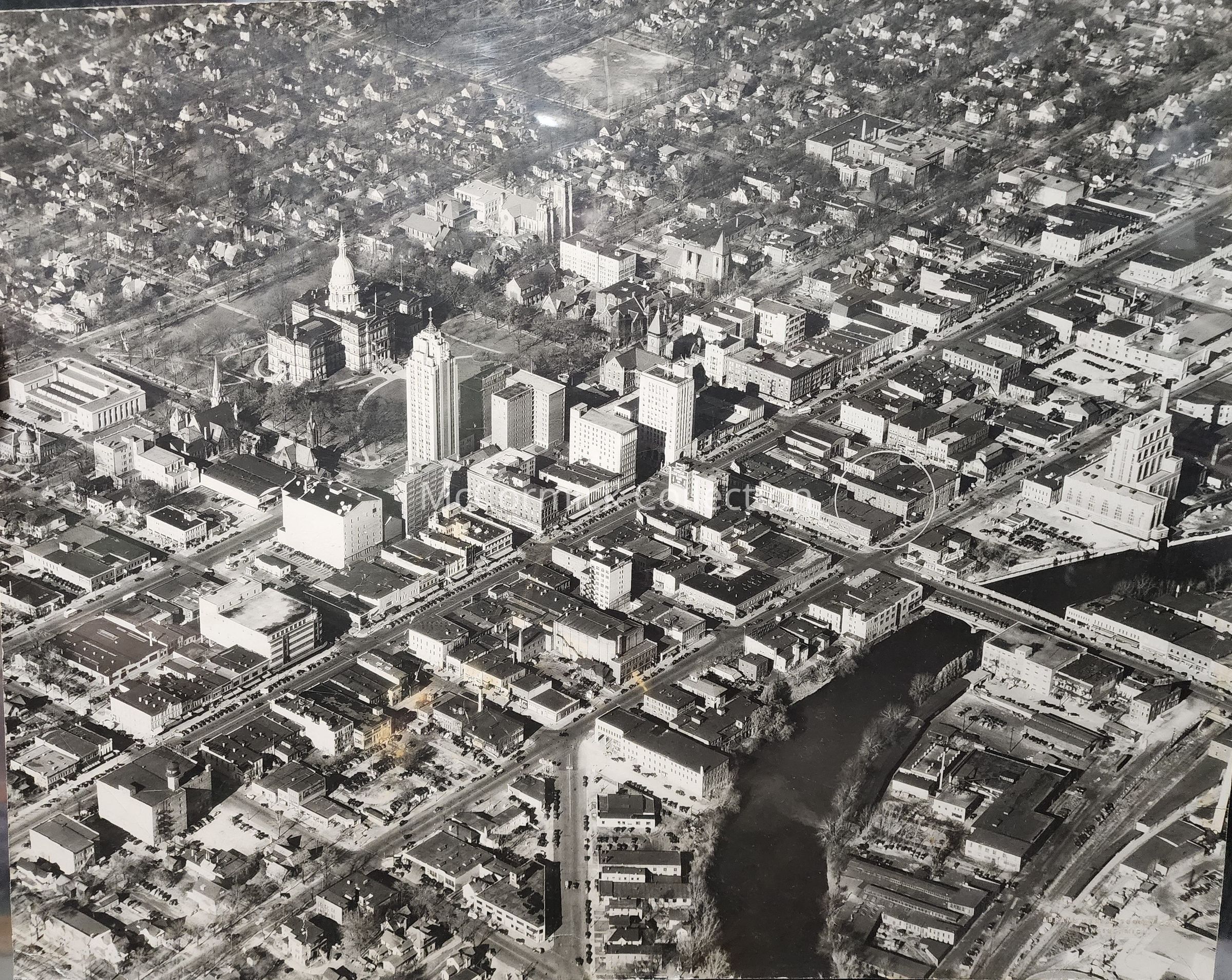 Large format aerial photograph of Downtown Lansing, Michigan, by Abrams Aerial Photography of Lansing. From Sophia Tessaris Estate. Hotel Detroit is circled on the photo.