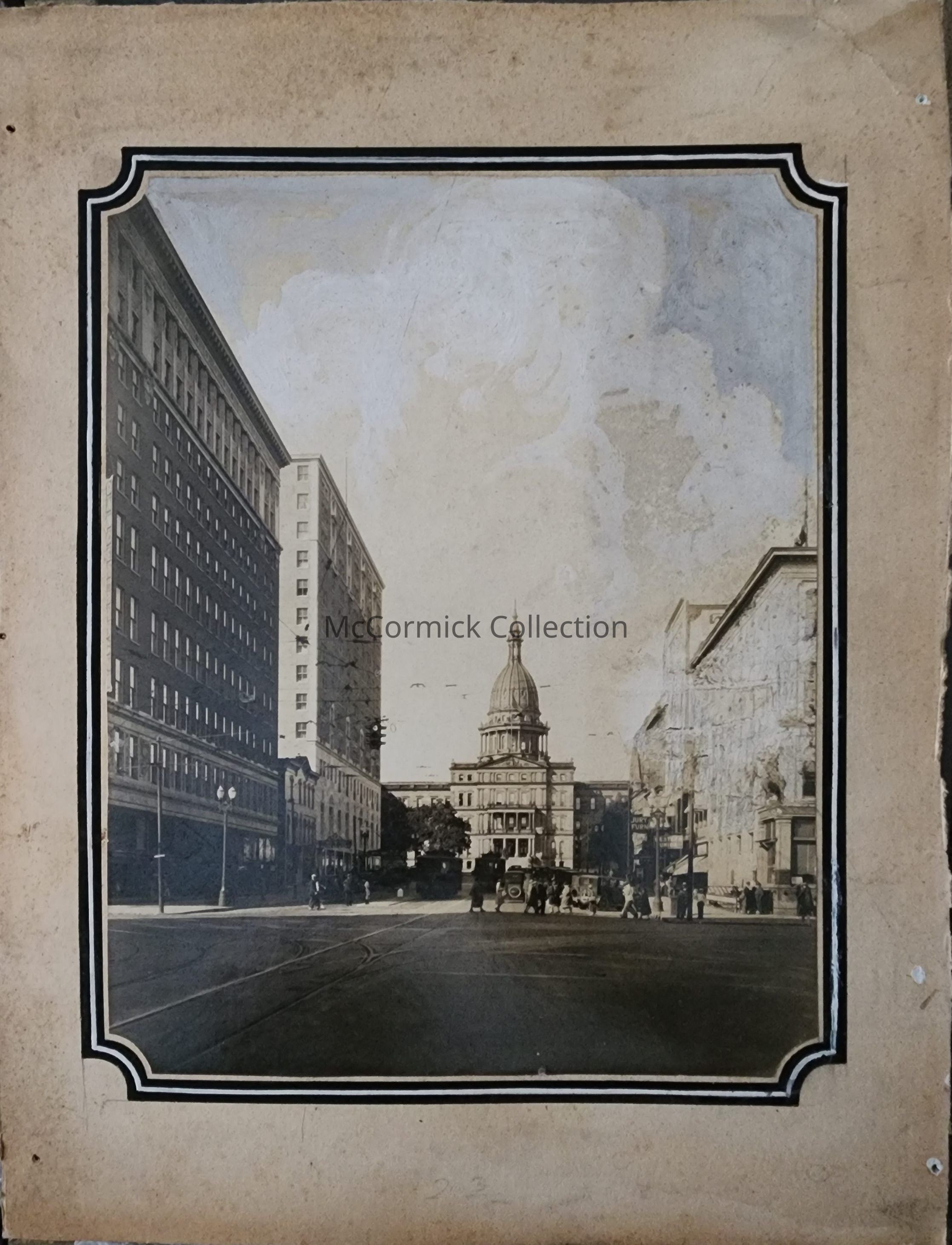 Photograph of downtown Lansing facing west down Michigan Avenue from Washington. Shows Capitol, Olds Hotel, Prudden Building, and others. Mounted to card backing.