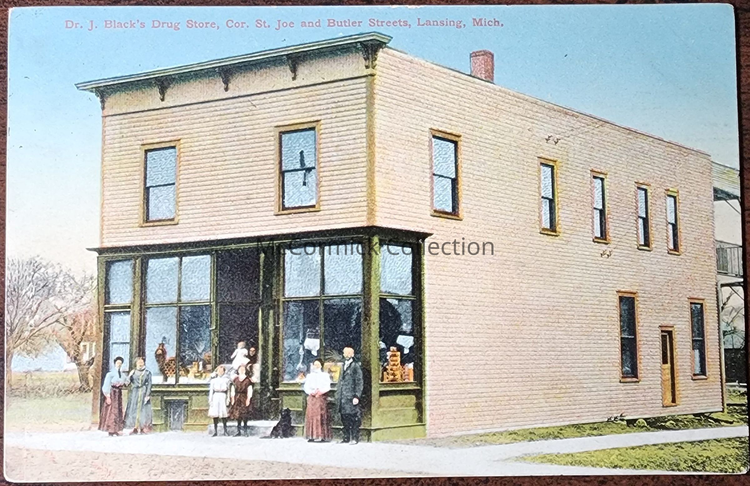 Dr. J. Black's Drug Store, Cor. St. Joe and Butler Streets, Lansing, Mich. Postcard