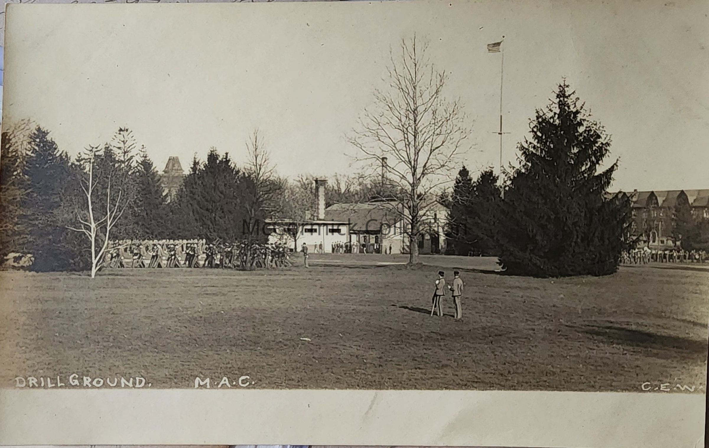 Real photo postcard of the Michigan Agricultural College Drill Ground. Photo by East Lansing photographer Charles E. Walter, C.E.W.
