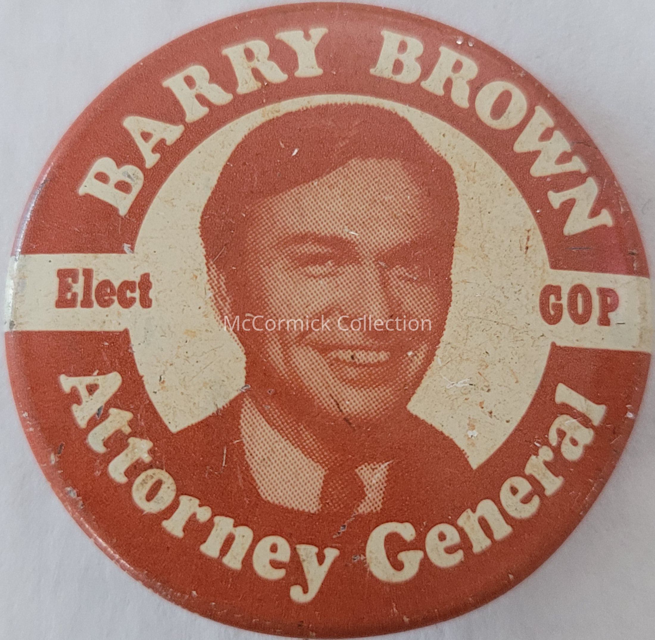 A 1.5" brown and white political button for Barry Brown for Attorney General of Michigan, circa 1970s.