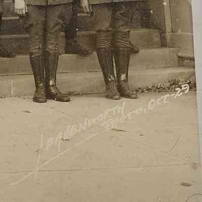 Framed photographic print of the 1929 Michigan State College Military Band with director Leonard Falcone. Posed on the steps of the People's Church in East Lansing.