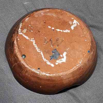 Vintage clay pottery ashtray with brown, blue, and white design. This was a gift to my grandfather Darwin Reed from his aunt Irene Gordon Rhynard.