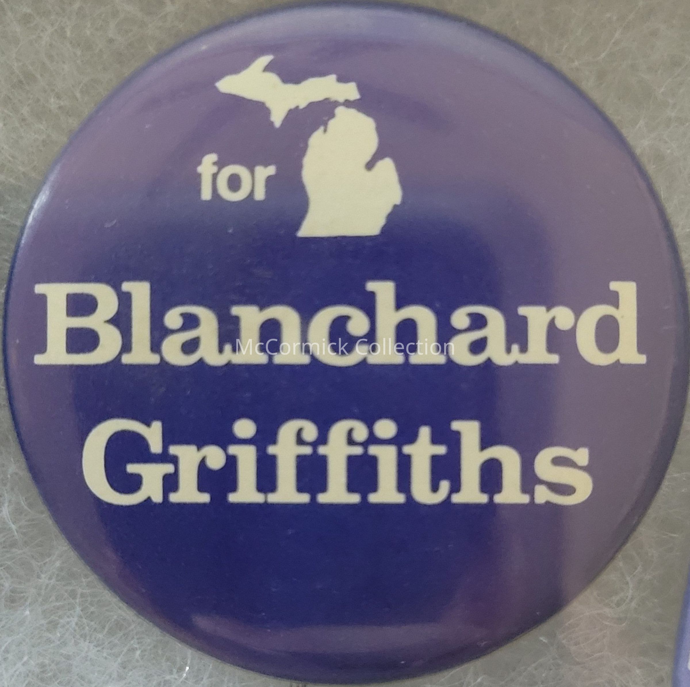 A 1.5" blue and white political button for Michigan for James Blanchard for Governor and Martha Griffiths for Lt. Governor, 1980s.