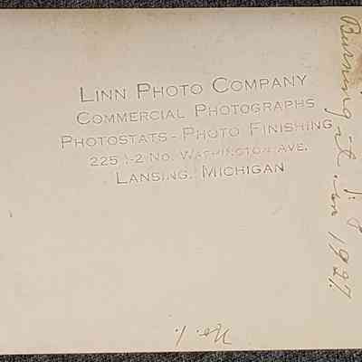 Photographic print of the ruins of the home of Andrew Keyhoe, perpetrator of the 1927 Bath School Bombing. He burned his home down before the school attack. Photo by Linn Photo Co. of Lansing, No. 1. Caption written on back.