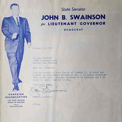 A 1958 letter on letterhead from the political campaign for State Senator John B. Swainson for Lieutenant Governor. Signed by Swainson. The letterhead features a picture of Swainson. Addressed to John Mitchell of Detroit.