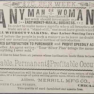 Advertising trade card for Mrs. Ann Hall of Lake, Mich., Agent for Newaygo County Merrill Mfg. Co. of Chicago.