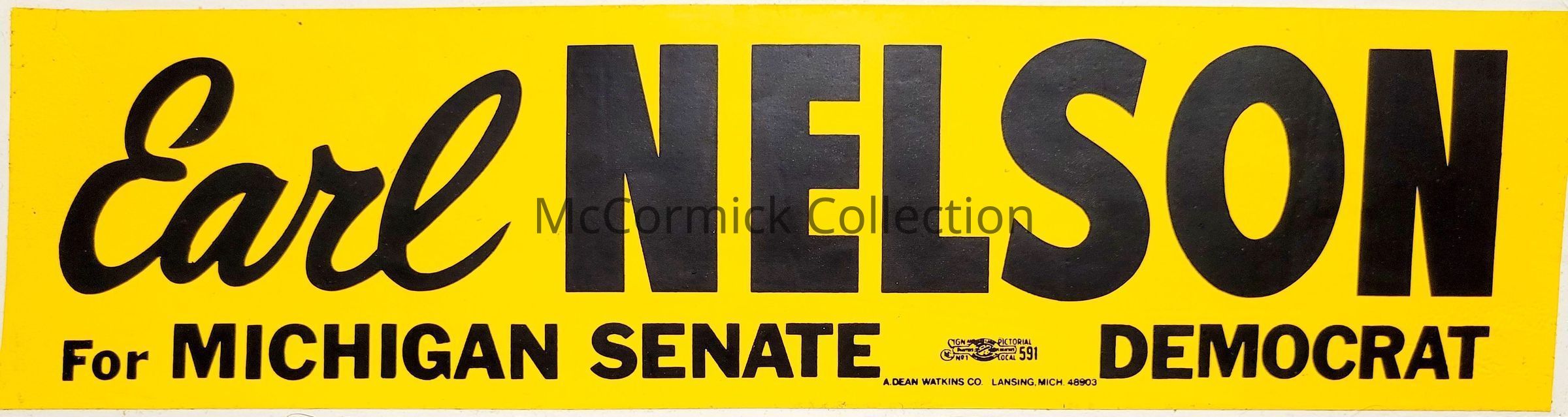 Yellow and black bumper sticker for Earl Nelson for Michigan Senate, circa 1970s.
