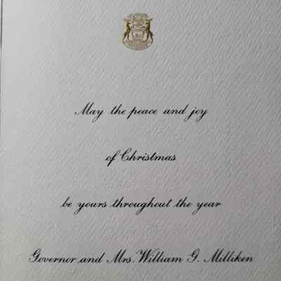 A circa 1970s (n.d.) Christmas card from the Milliken family with a photo of Governor William Milliken and Helen Milliken, featuring a photo taken at the Governor's Residence in Lansing.