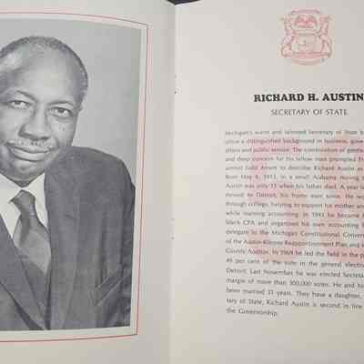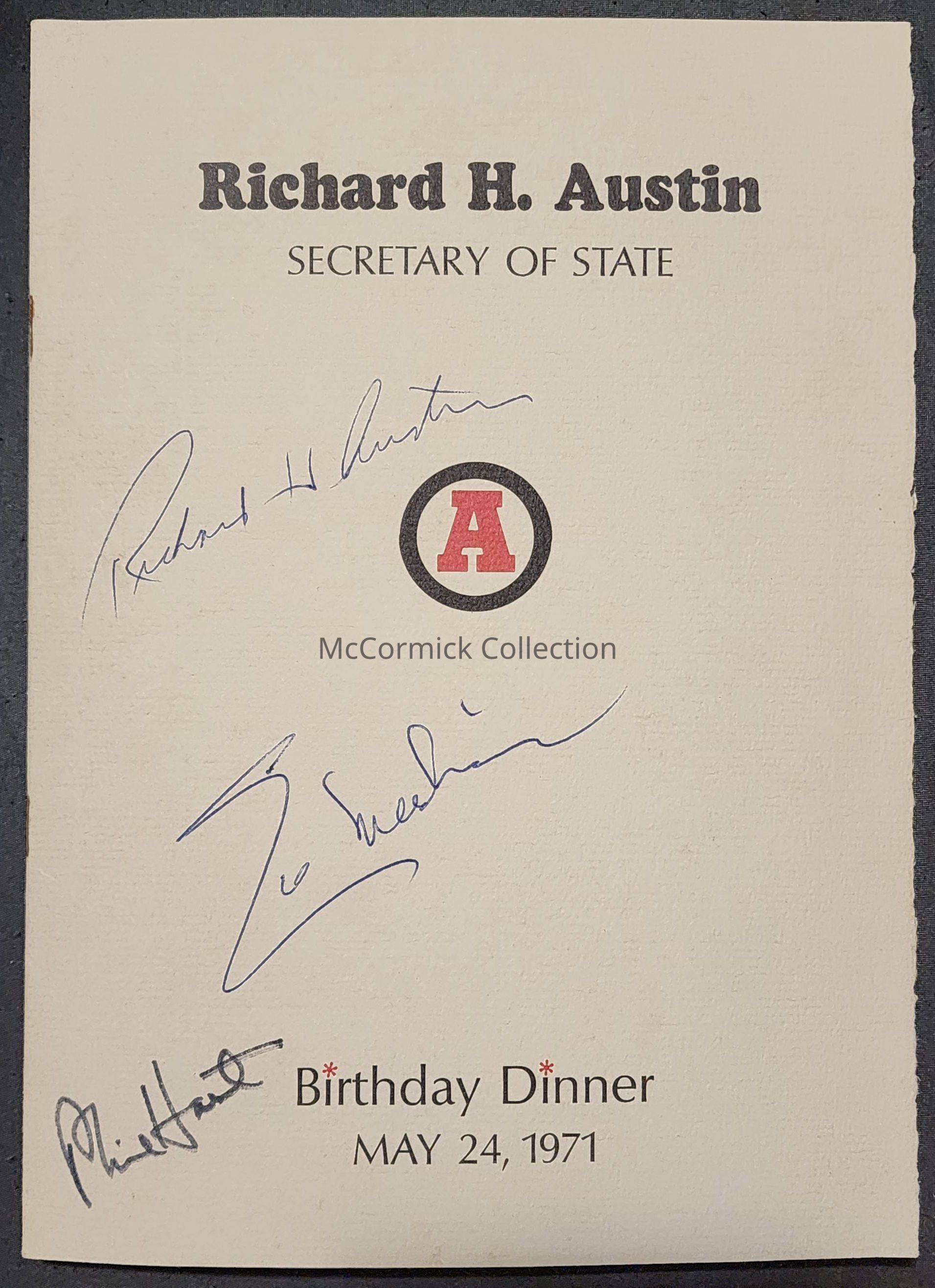 A signed 1971 program from a birthday dinner for Michigan Secretary of State Richard H. Austin. Signed by Austin, Phil Hart, and one other unidentified signature.