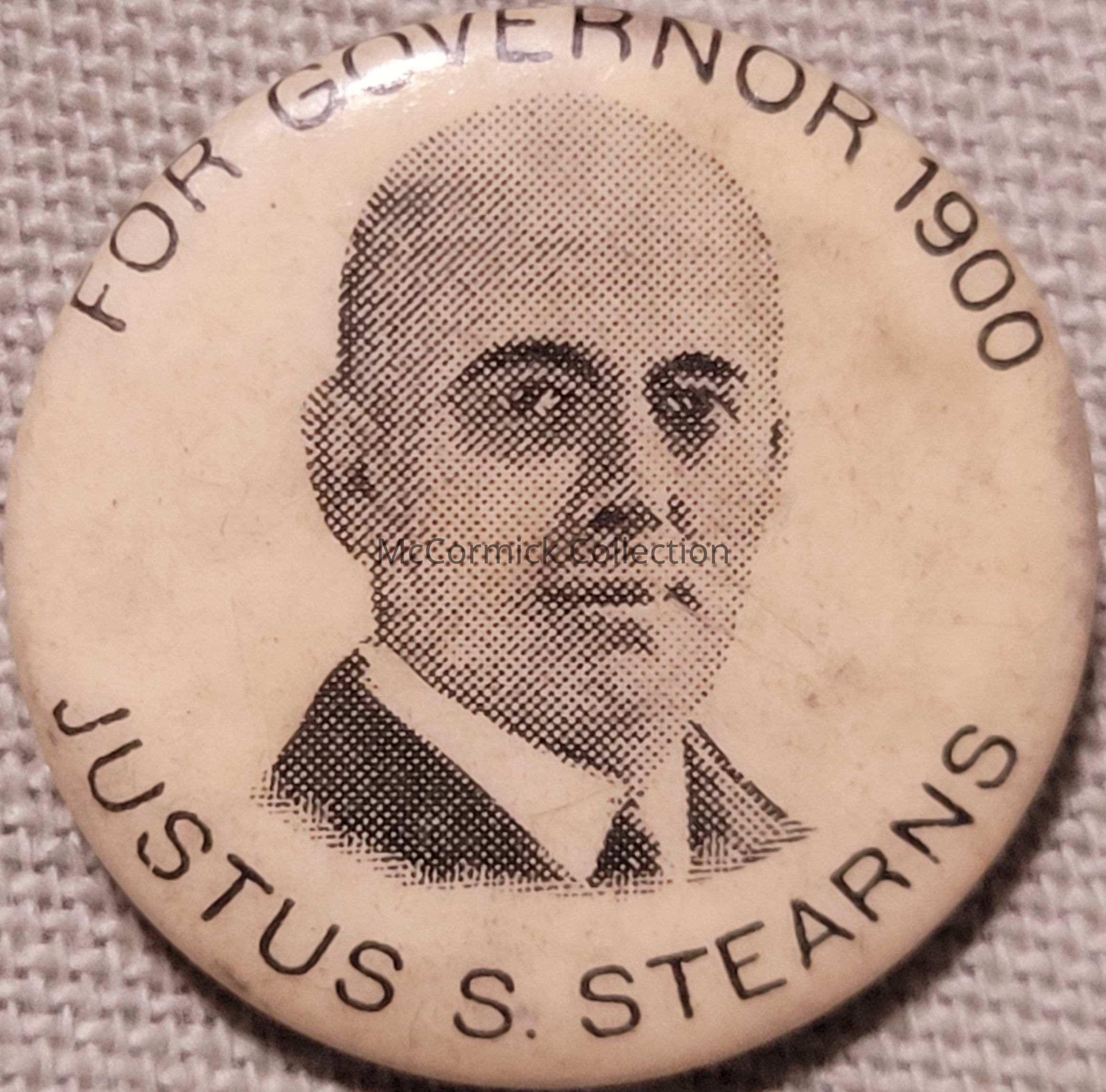A political cello button for Justus Stearns for Governor of Michigan, 1900.