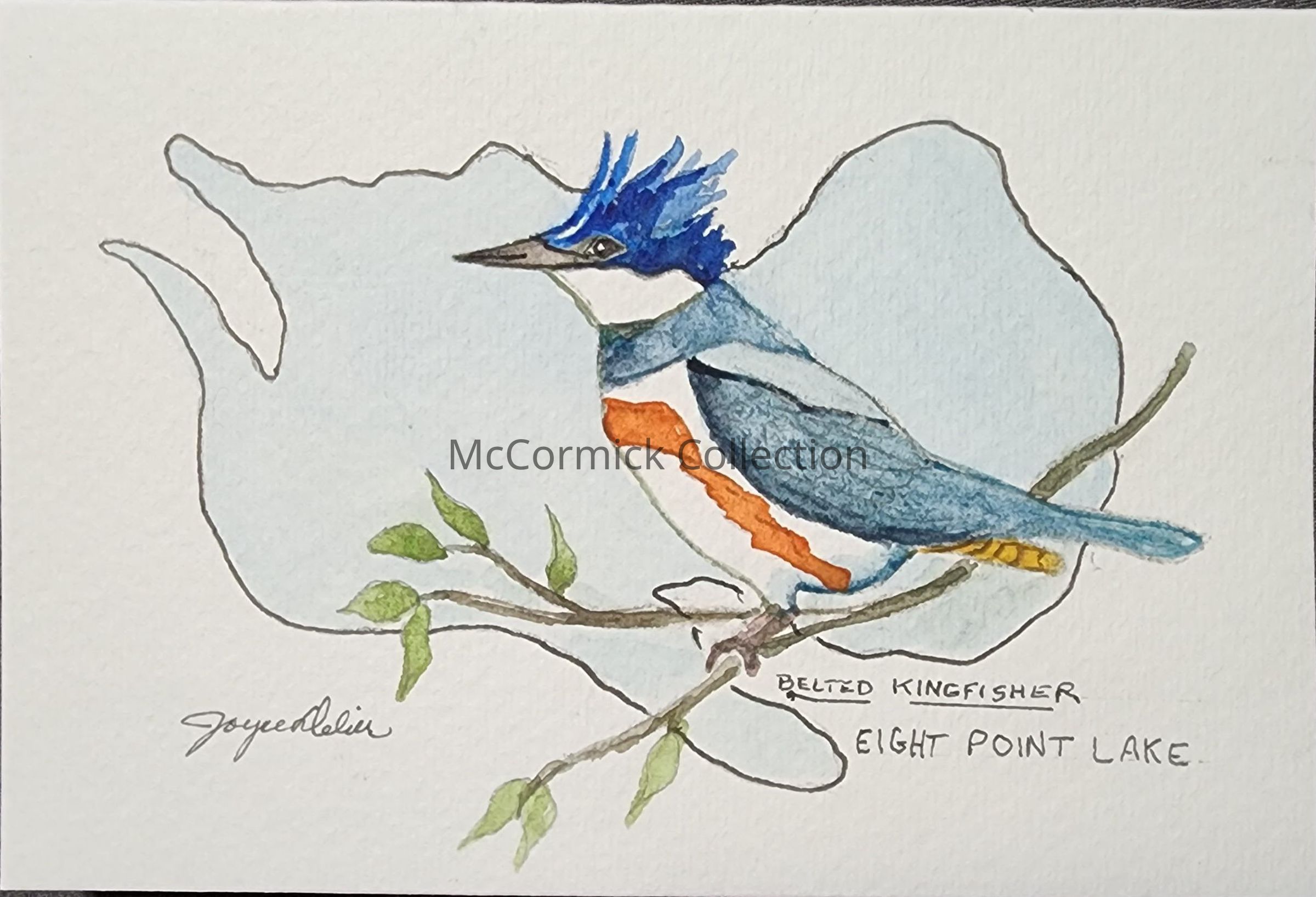 Card size Watercolor of Eight Point Lake and a Belted Kingfisher bird by Joyce Delier.