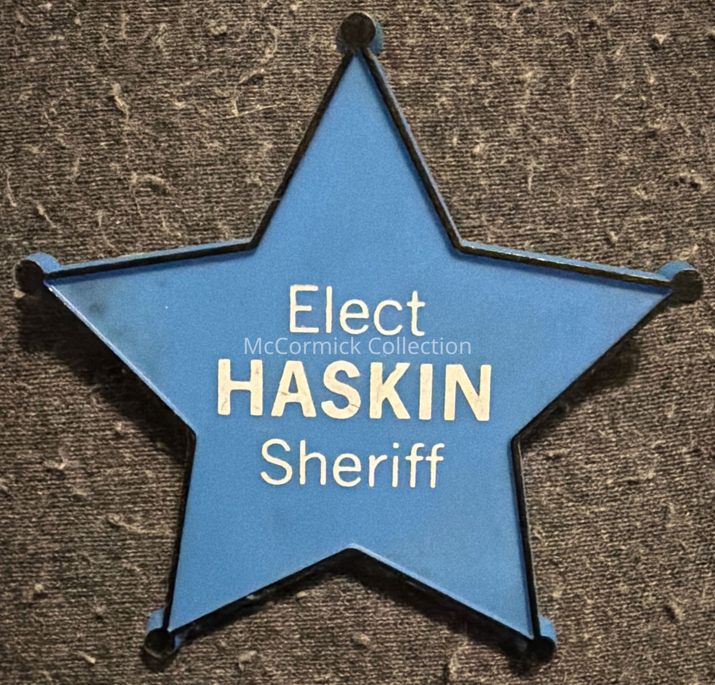 Plastic badge shaped pinback for Howard Haskin for Clare County Sheriff, circa 1980s.