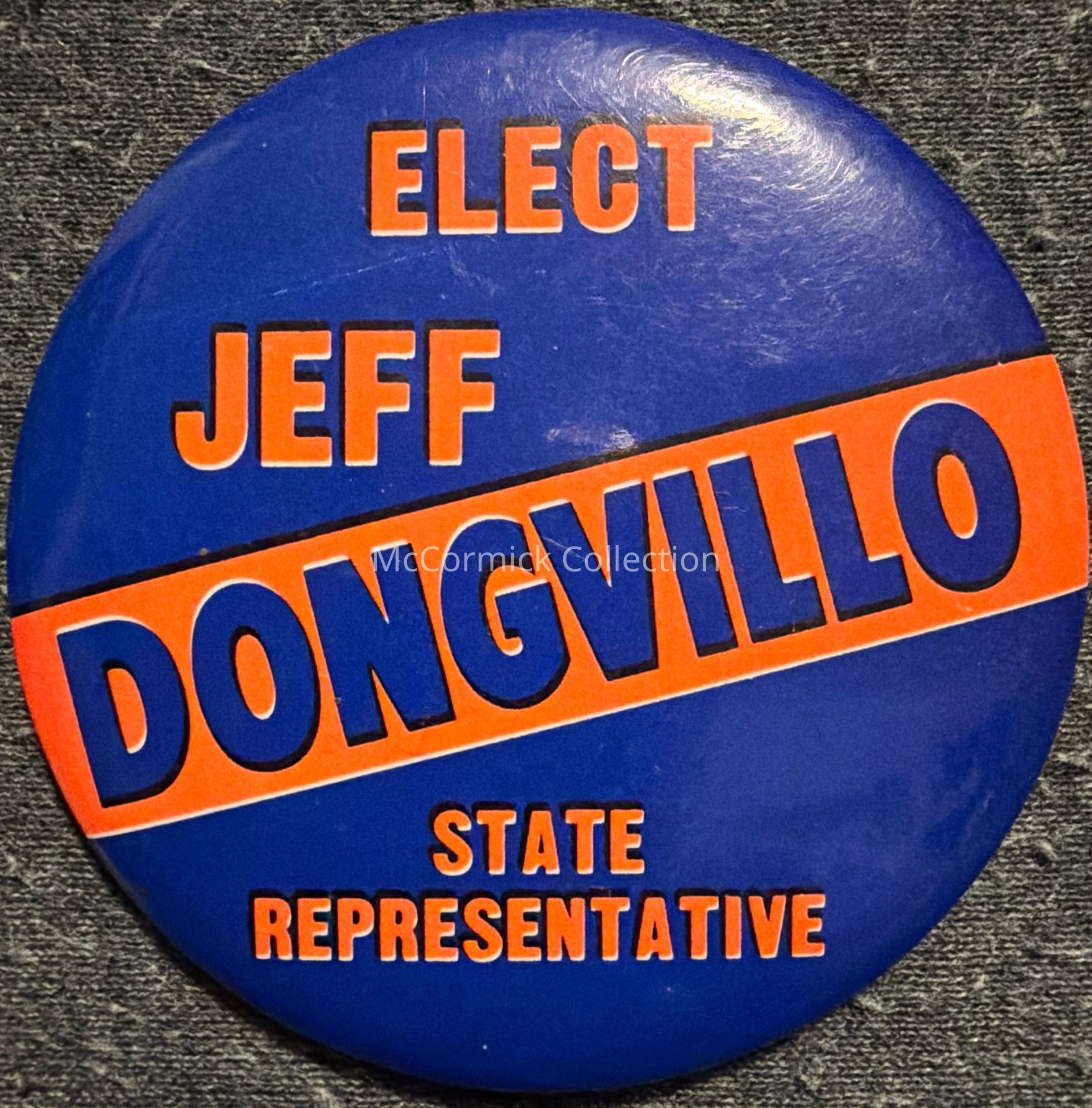 A 2.25” blue and orange political button for Jeff Dongvillo for Michigan State House of Representatives. From the Kingdon collection.