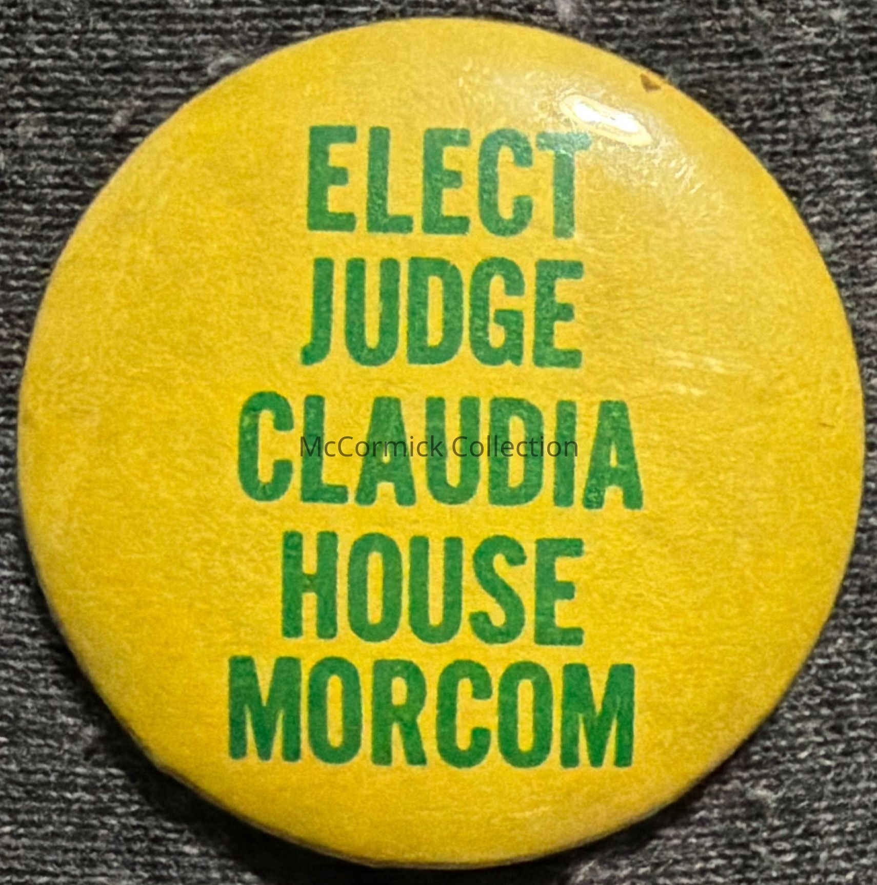 A 1.5” yellow and green political button for Claudia House Morcom. The first African American woman elected to the Wayne County Circuit Court. From the Kingdon collection.