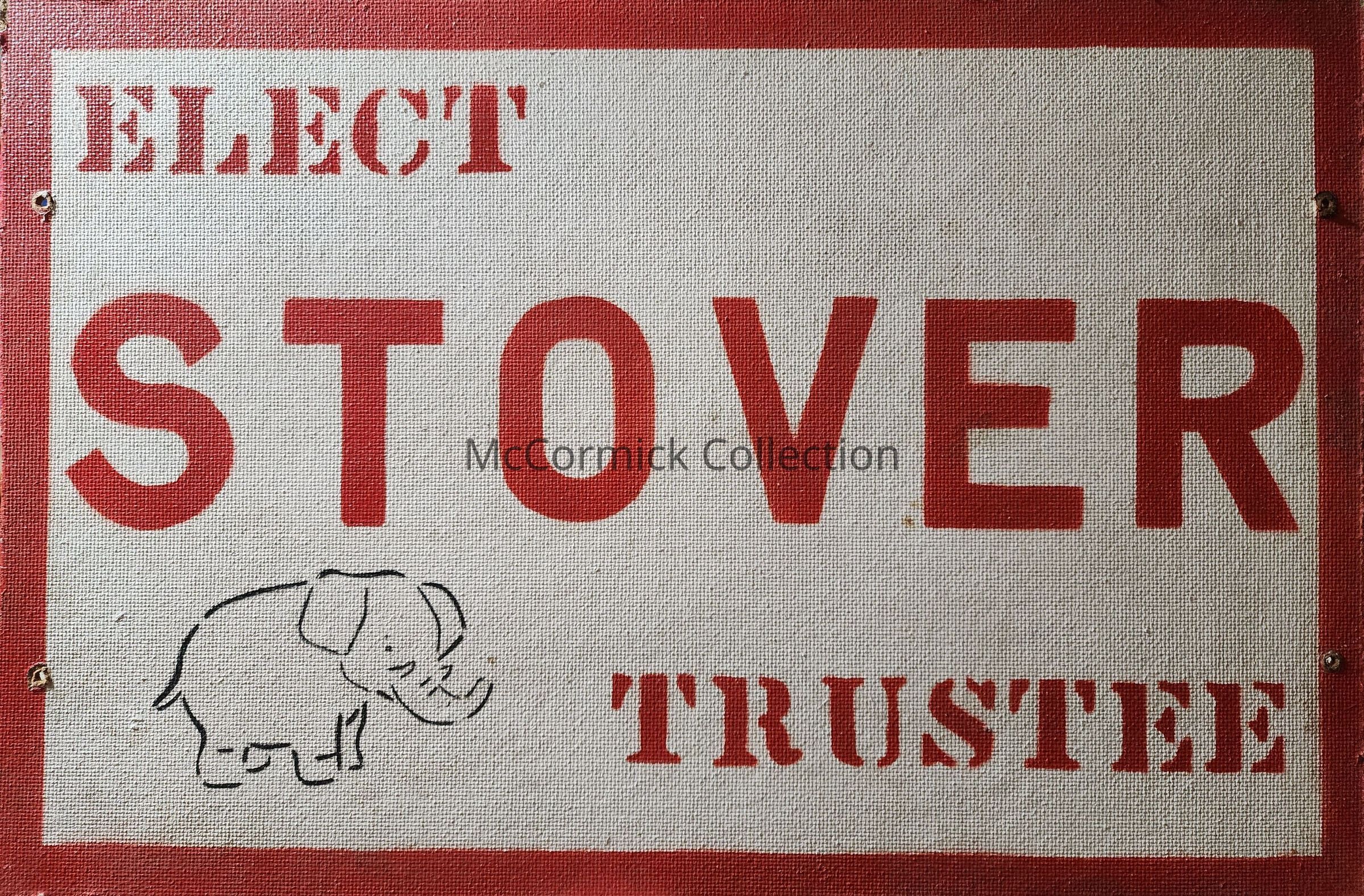 Masonite sign promoting the election of Frank Stover as Delhi Township Trustee, circa 1970s. Features elephant symbol for the Republican party. From the estate of Frank Stover.