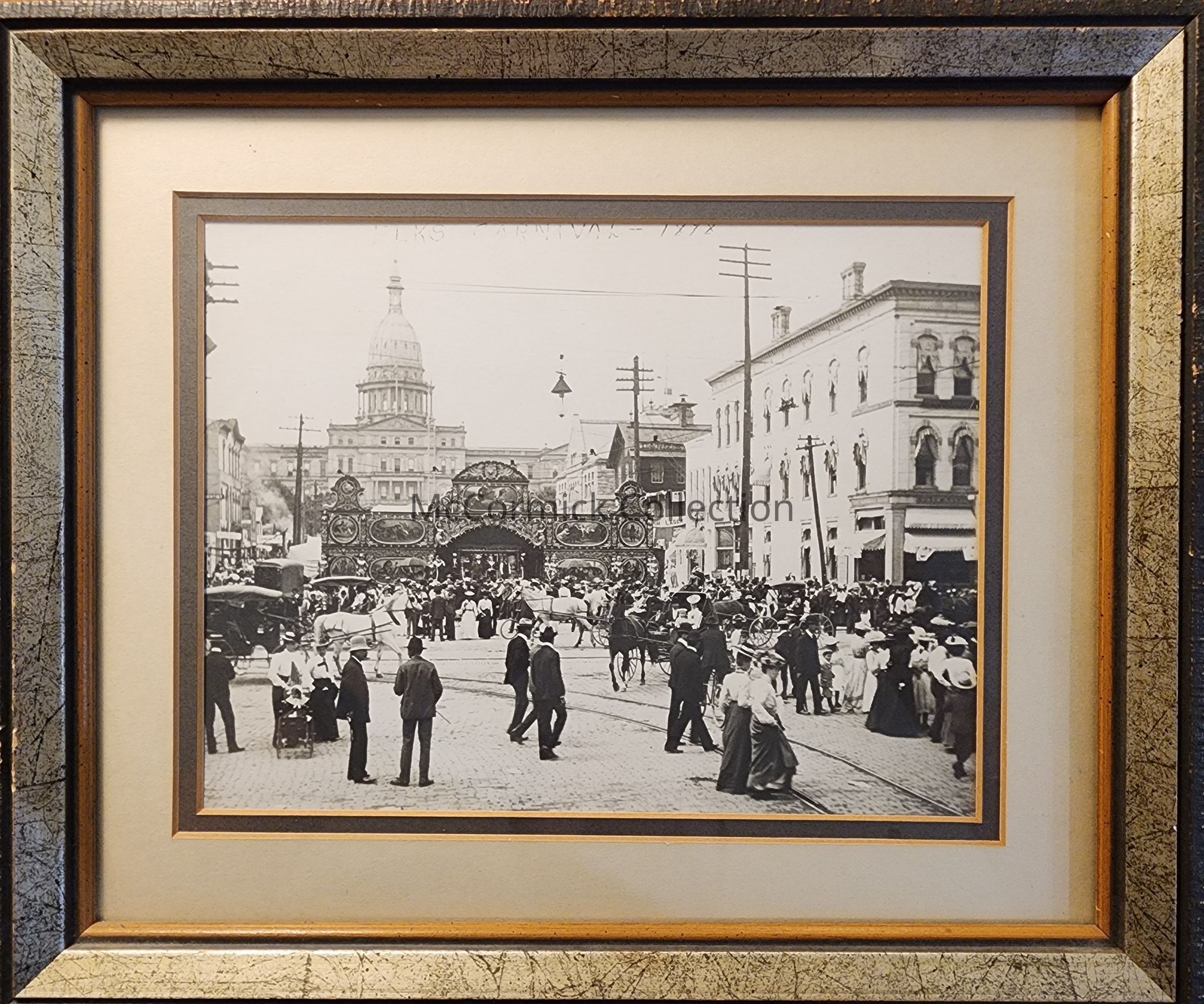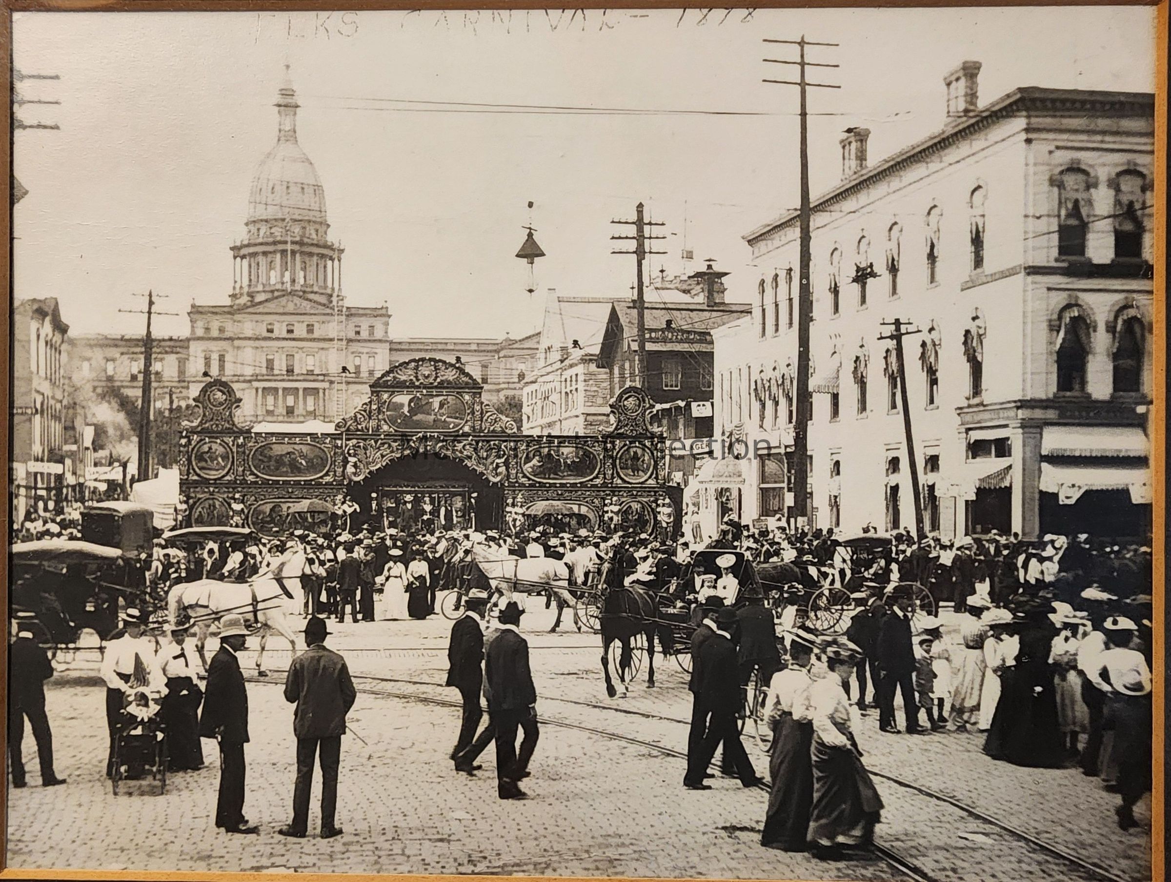 Framed photograph of the Elks Carnival in downtown Lansing, Michigan, on Michigan Avenue near the corners of Capitol and Washington Avenues. A large stage is in the middle of the street and the Michigan State Capitol is in the background. It is captioned as the "Elks Carnival - 1878" (the date is incorrect).