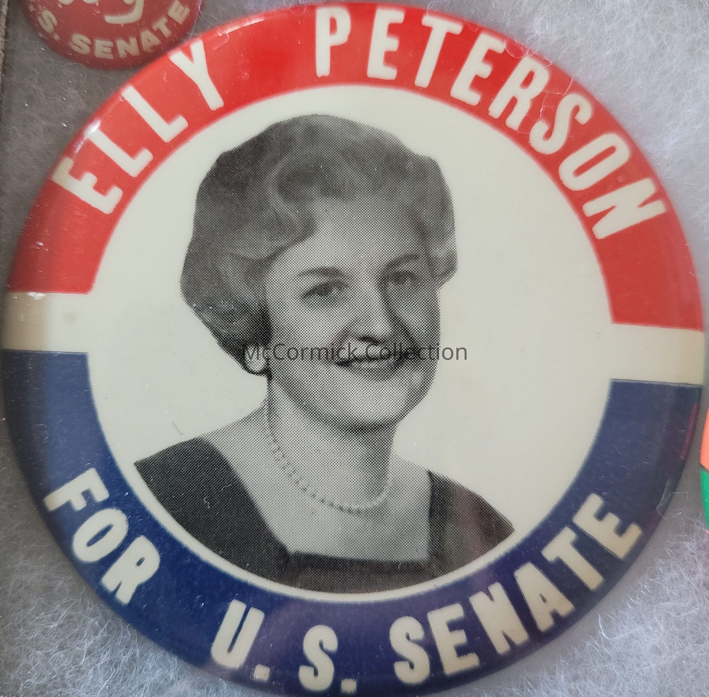 A 3.5" red, white, blue, and black political picture button for Elly Peterson for United States Senator, 1964.