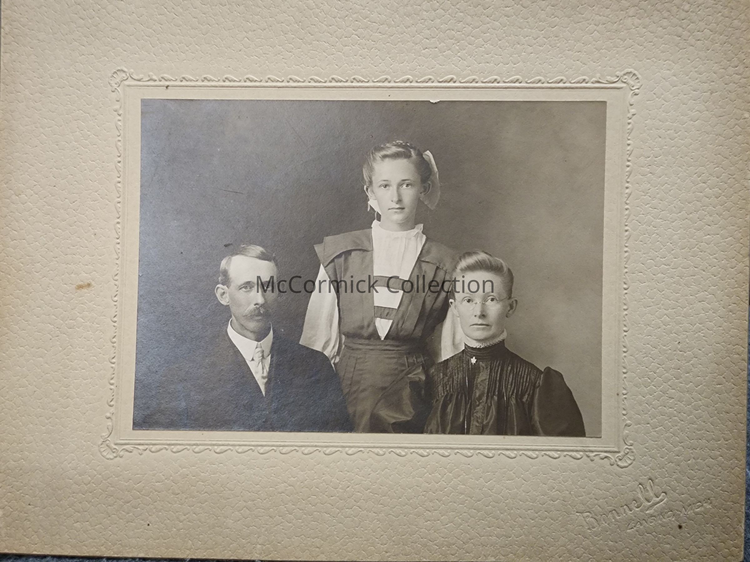 Card mounted photograph of Elmer Dakin and his wife and daughter Myrle by Lansing photographer Bonnell.