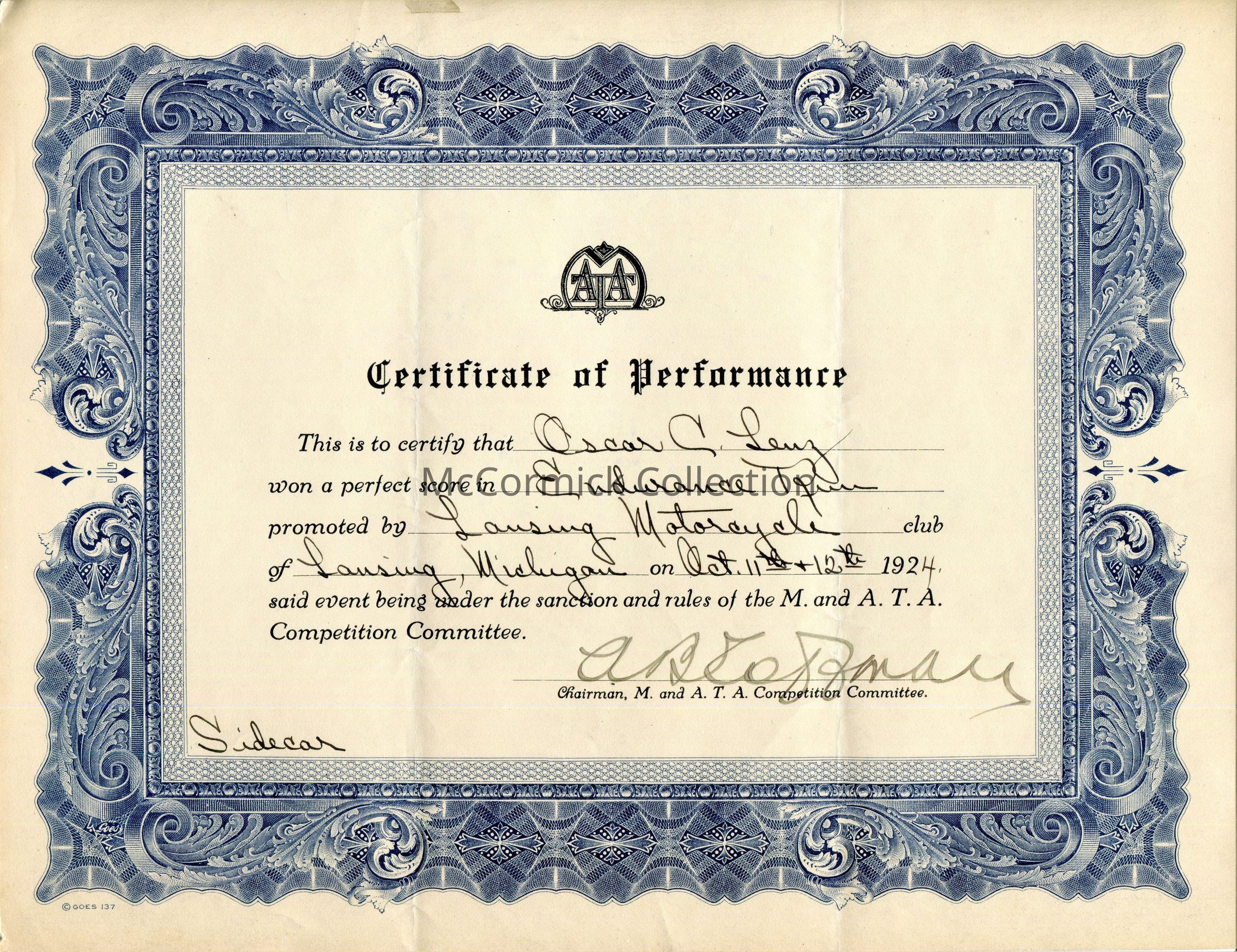 "Certificate of Performance / This is to certify that Oscar C. Lenz won a perfect score in Endurance Run promoted by Lansing Motorcycle club of Lansing, Michigan on Oct. 11th + 12th 1924, said event being under the sanction and rules of the M. and A.T.A. Competition Committee."