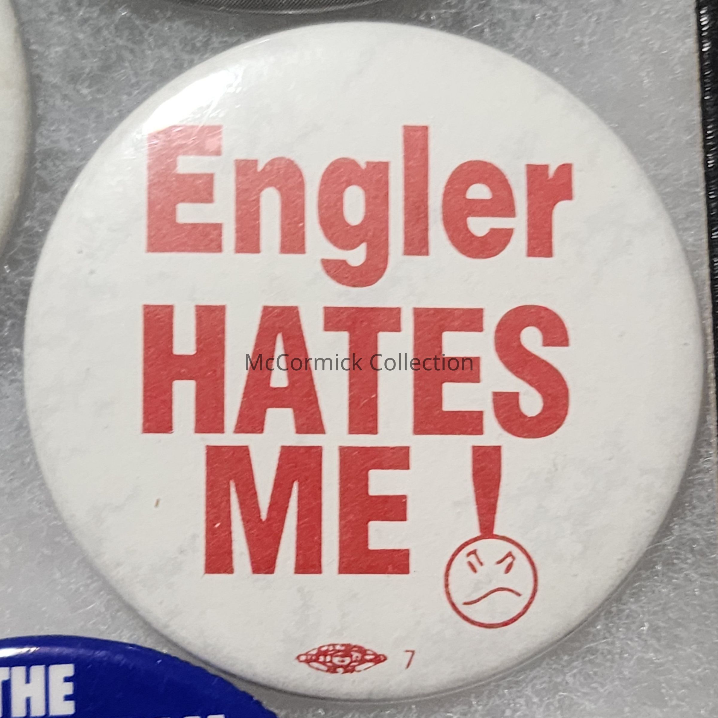 A 2.25" red and white anti political button opposing John Engler for Governor, circa 1990s.