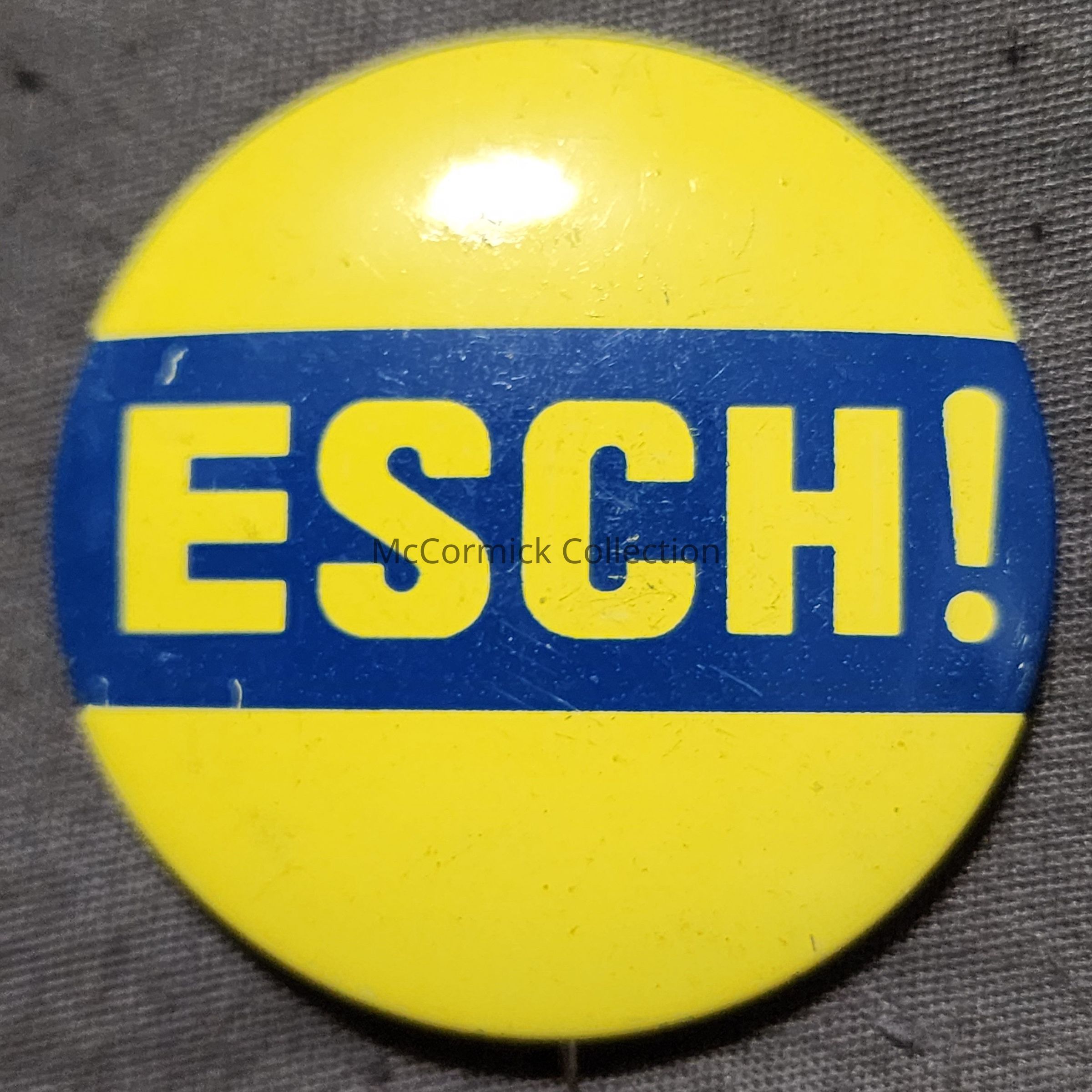 A 1.5" blue and yellow political button for Marvin Esch for Senate, circa 1976.