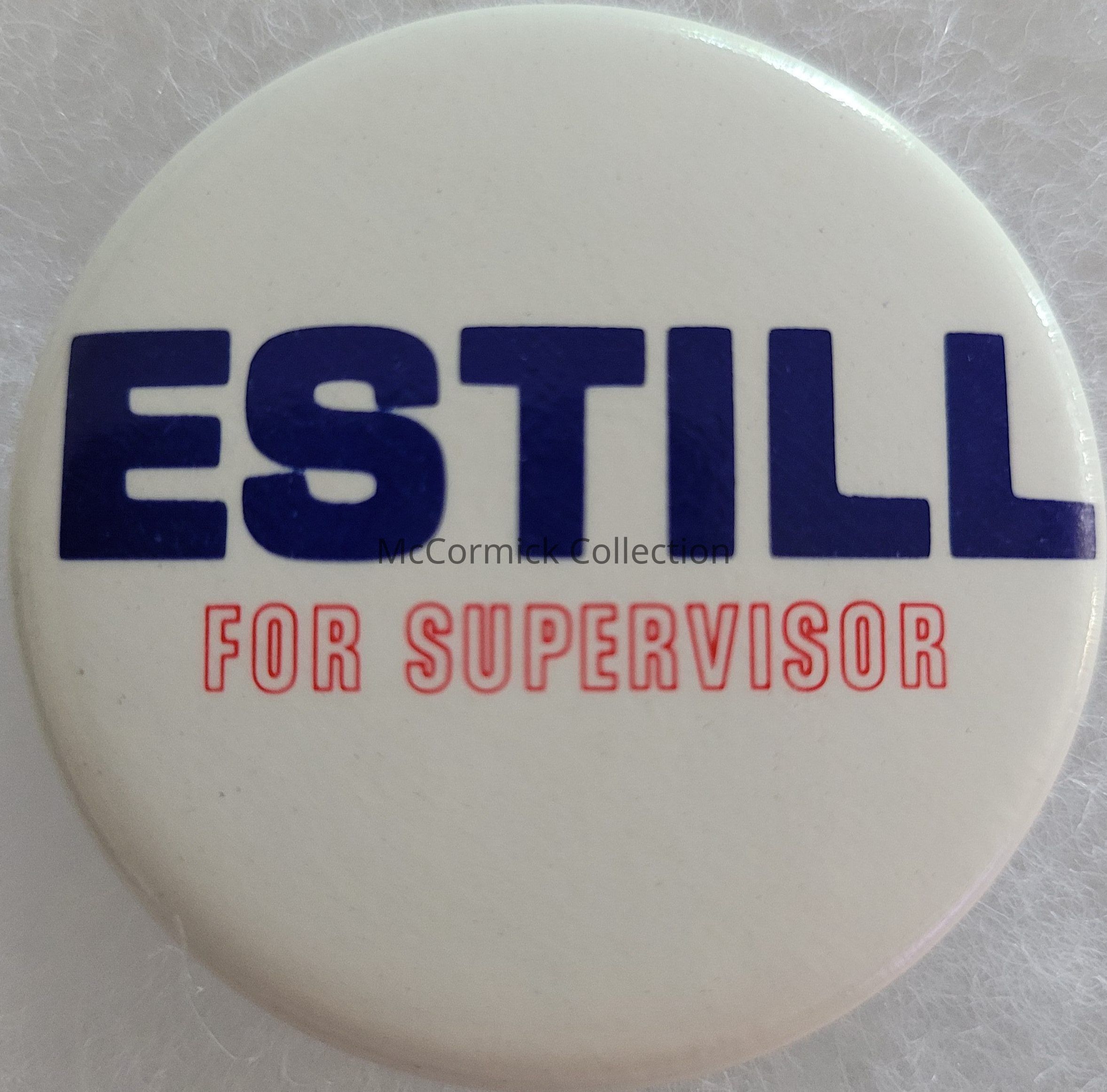 A 1988 1.75" political button for Estill for Delhi Township Supervisor. Kingdon Collection.