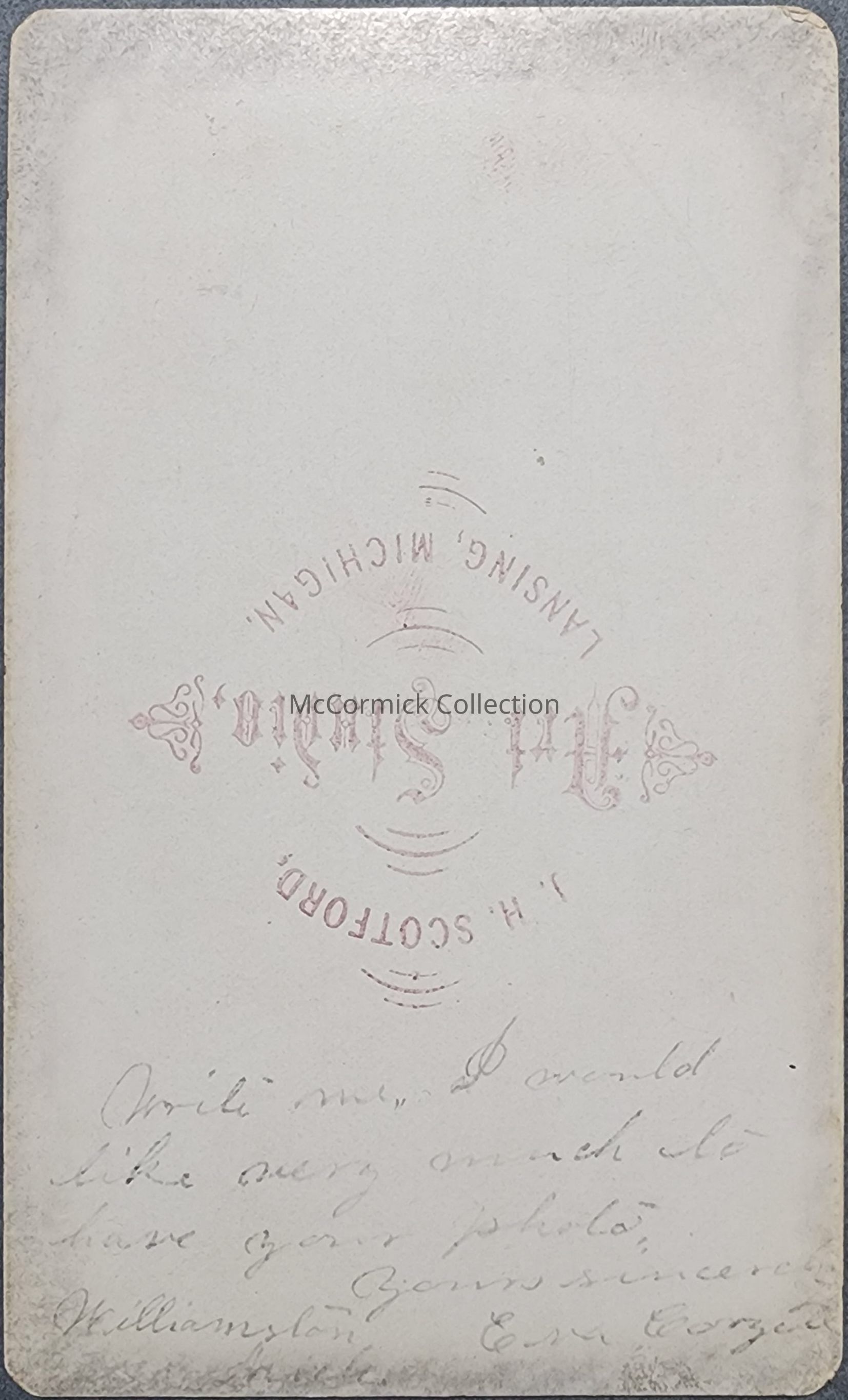 Written on the back: "Write me. I would very much like to have your photo. Yours sincerely. Eva Coryell, Williamston."Made/Created