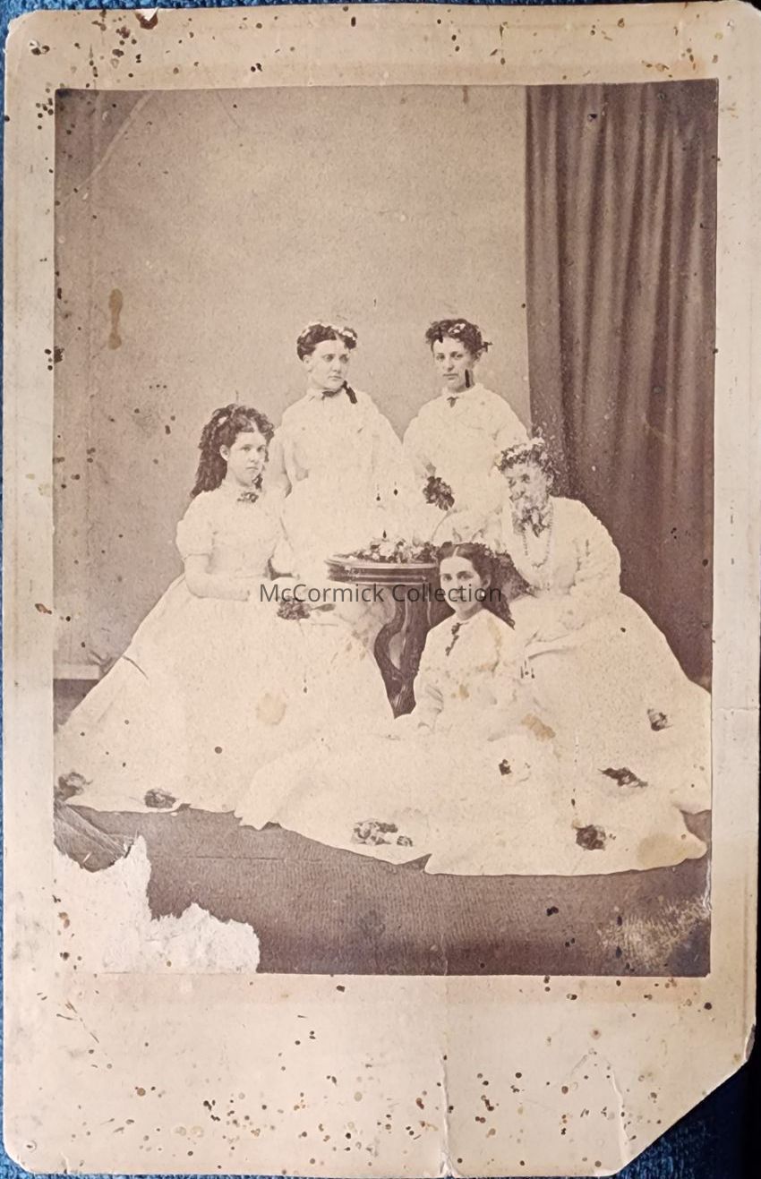 Cabinet card photograph of the five Sparrow sisters, Eva Sparrow Davis (far left) and (in no order) Alicia Sparrow Lansing, Isabella Sparrow, Mary Henrietta Sparrow Orloff, and Mrs. Wilson Oyer. Sisters of Edward W. Sparrow. Eva married B.F. Davis. Photograph unidentified, circa 1870.