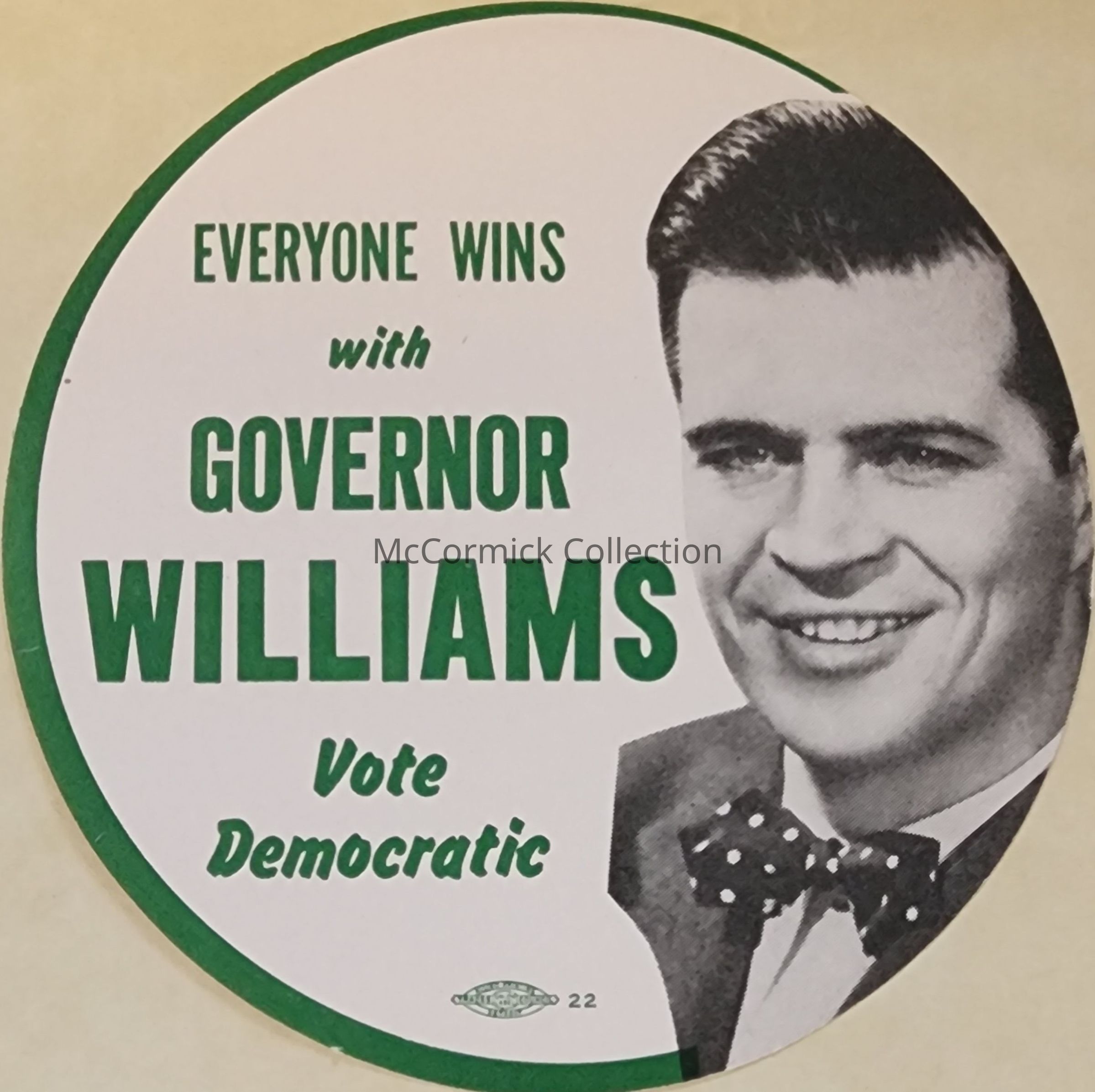 Round sticker decal for Michigan Governor G. Mennen Williams, circa 1950s.