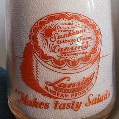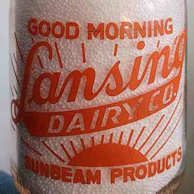A round tall-neck orange pyro quart bottle from the Lansing Dairy Co. A "Good Morning" slogan. The back slogan is for "Creamed Sunbeam Cottage Cheese."