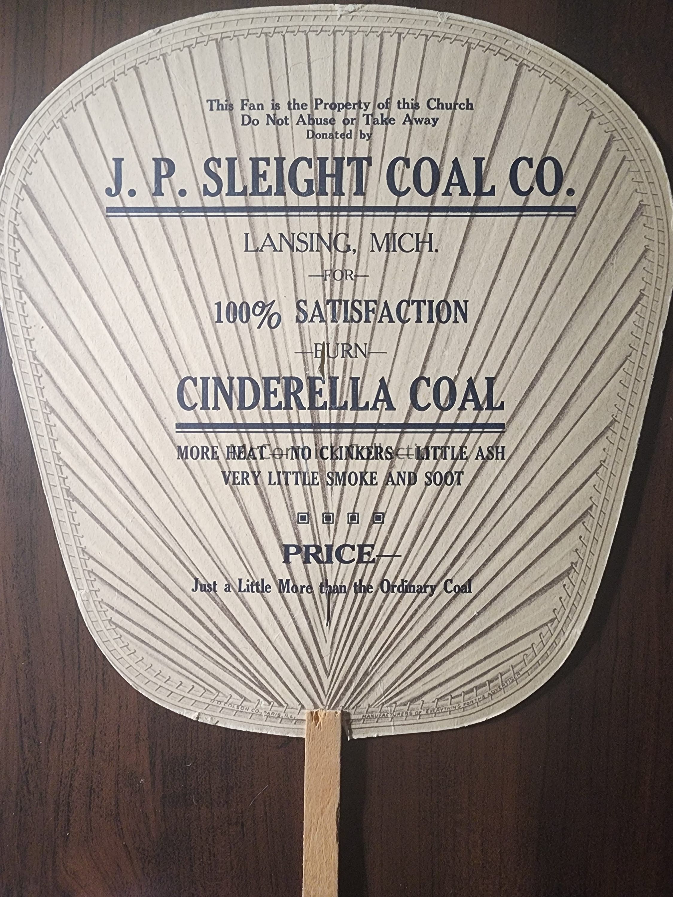A paper and wood advertising fan for the J.P. Sleight Coal Co. of Lansing.