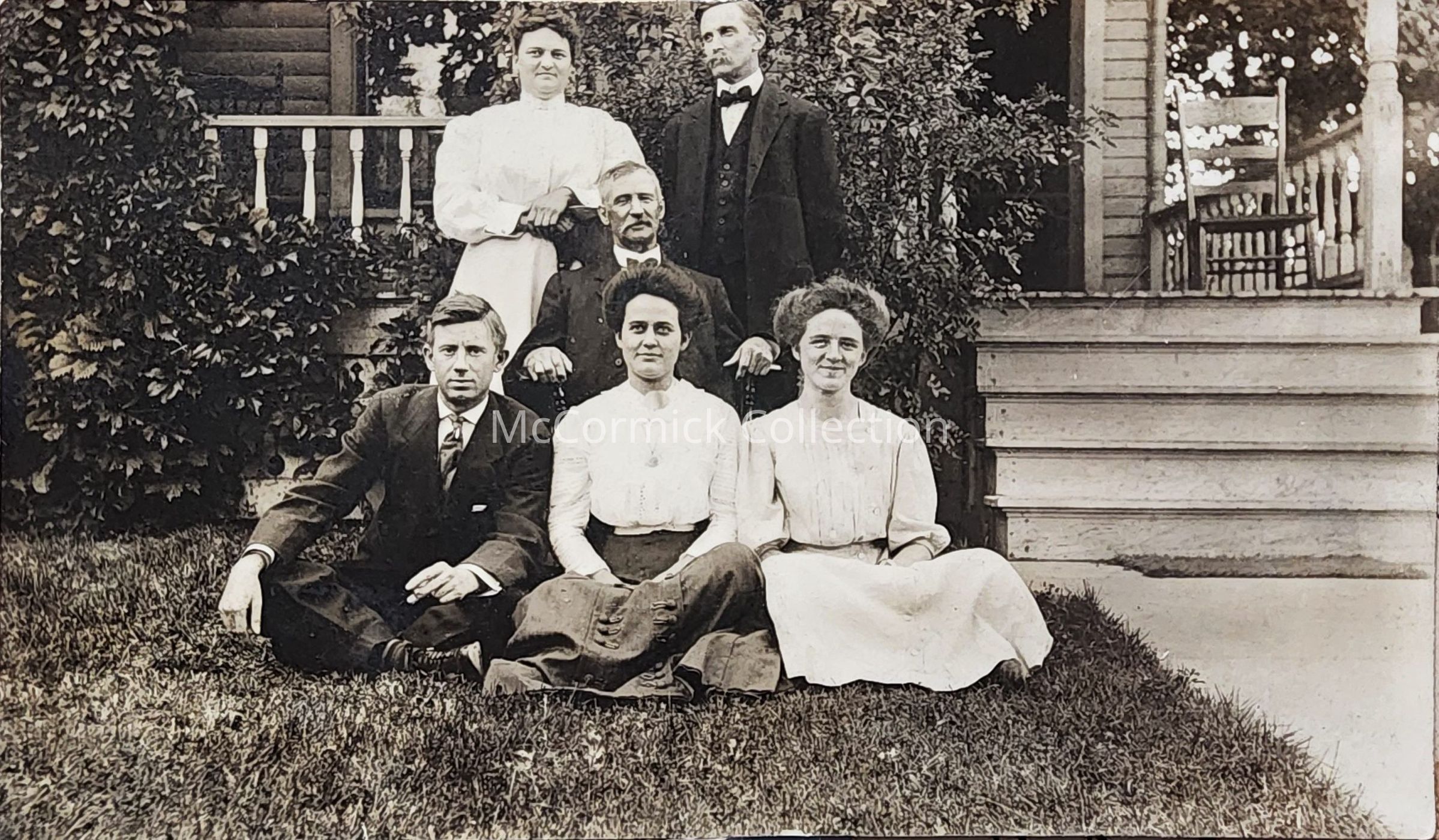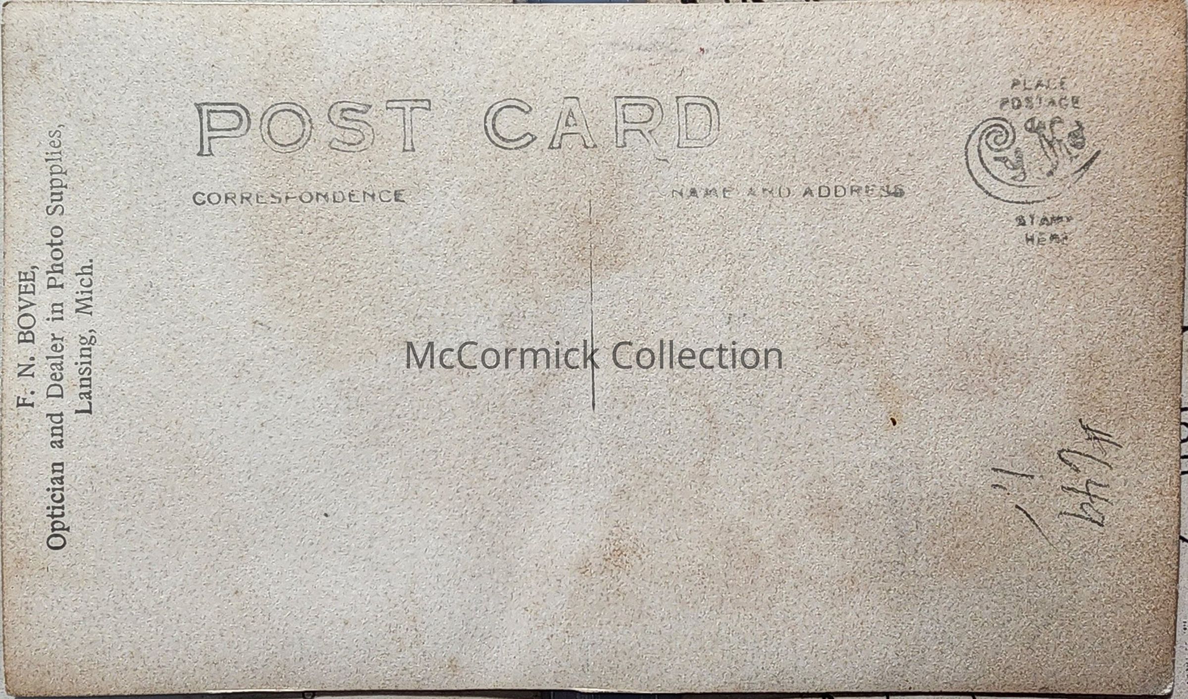 Real photo postcard of a Family sitting in their house's yard, possibly Lansing. By Bovee. Postally unused.