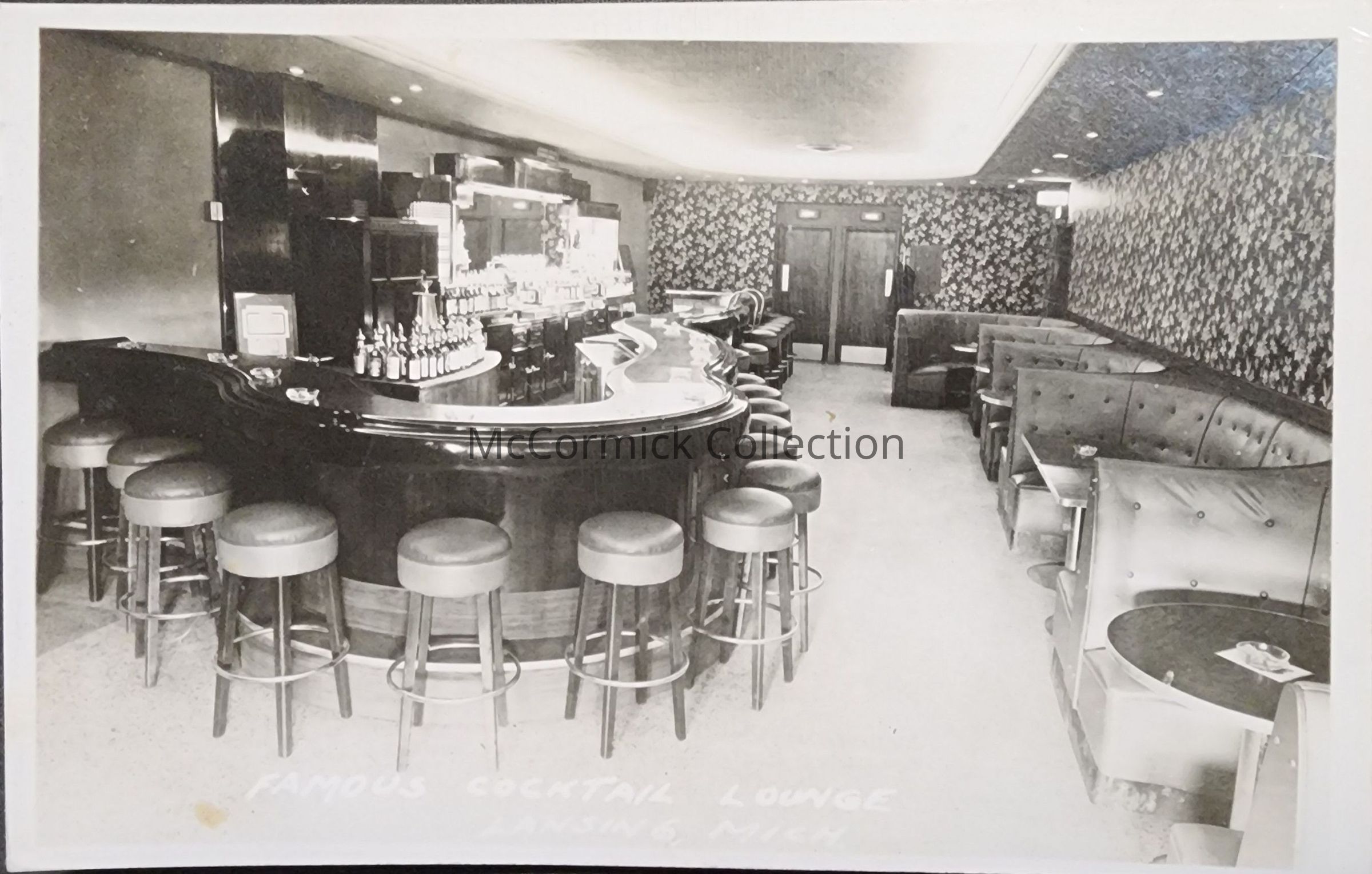 Real photo postcard of the Famous Cocktail Lounge in Lansing, Michigan. Postmarked 1947.