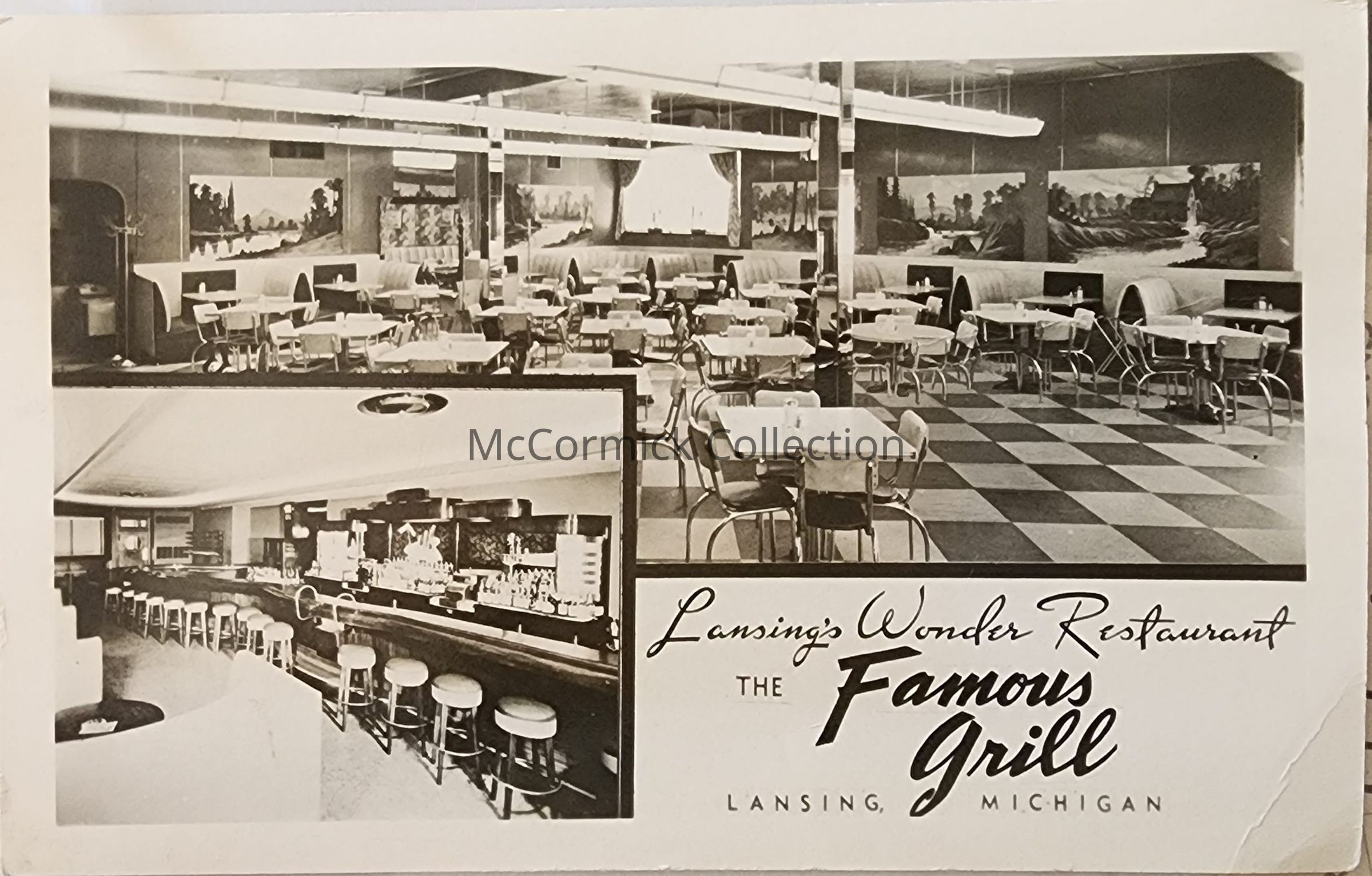 Real photo postcard of the interior of Lansing's Wonder Restaurant, The Famous Grill, Lansing, Michigan.