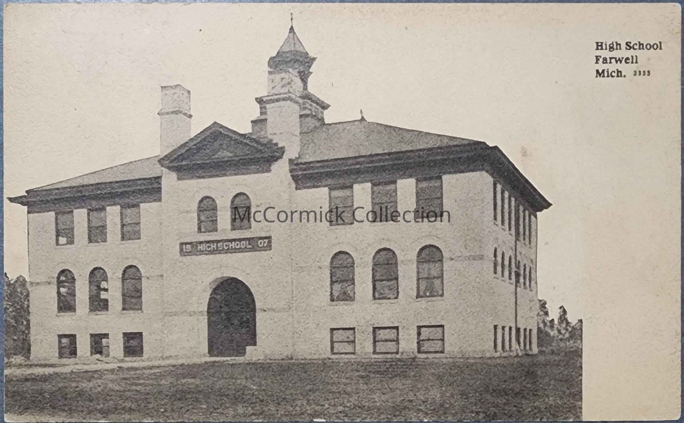 Postcard of Farwell High School with 1910 Lake, Mich. postmark.