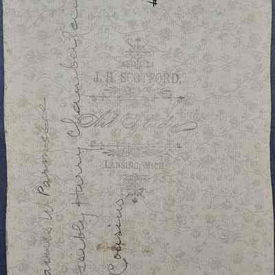 Cabinet card of two boys in a studio prop boat. They are identified as James W. Parmelee and possibly Garry Chamberlain, cousins. Photo by Lansing photographer John Harvey Scotford. Circa 1877-81.Made/Created