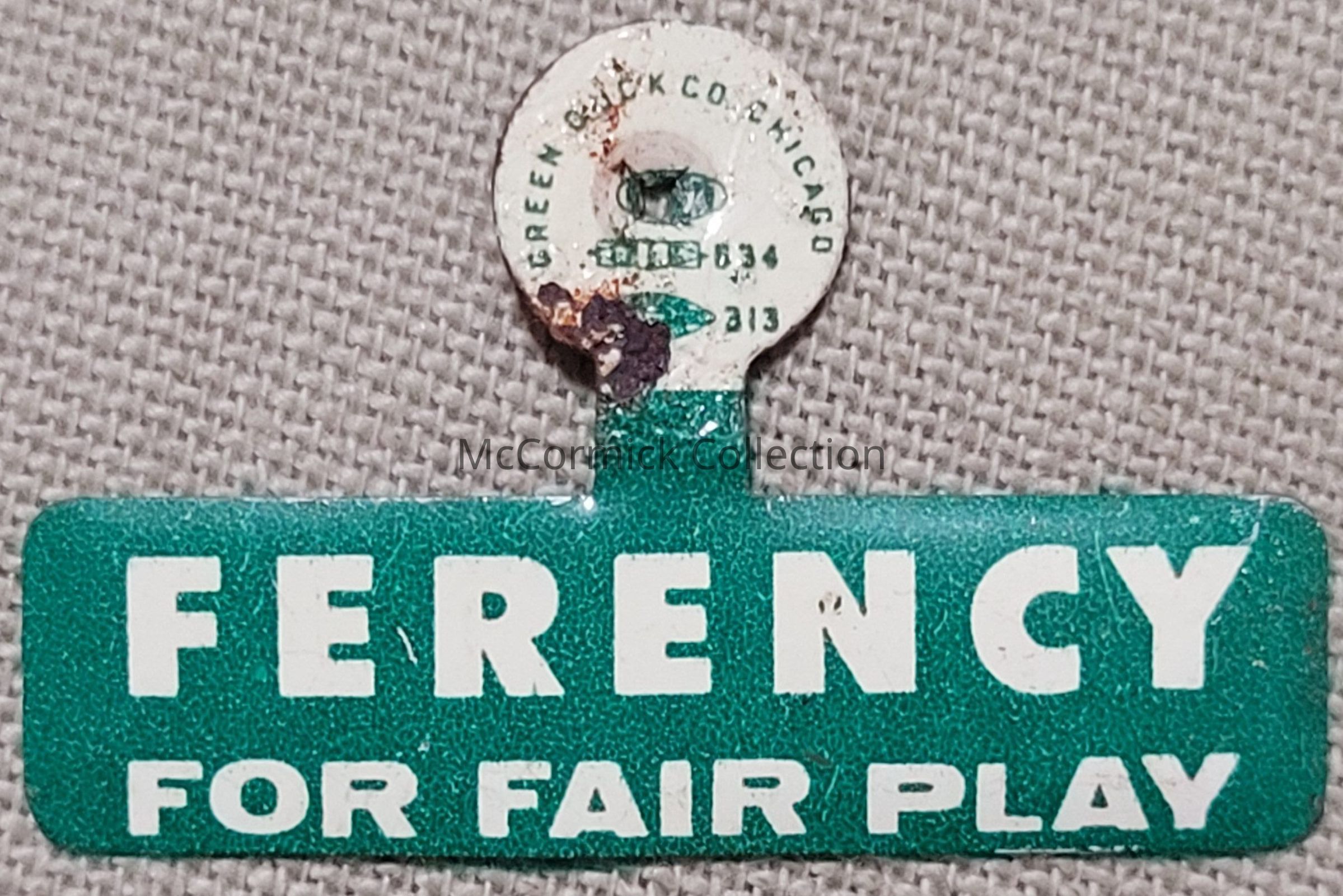 Green and white political tab for Zolton Ferency, reading "Ferency for Fair Play." Circa 1960s.